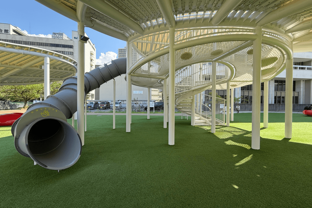 福井市役所のすぐ隣にある「中央公園」は、子どもがのびのび過ごせる広々とした都市型公園。