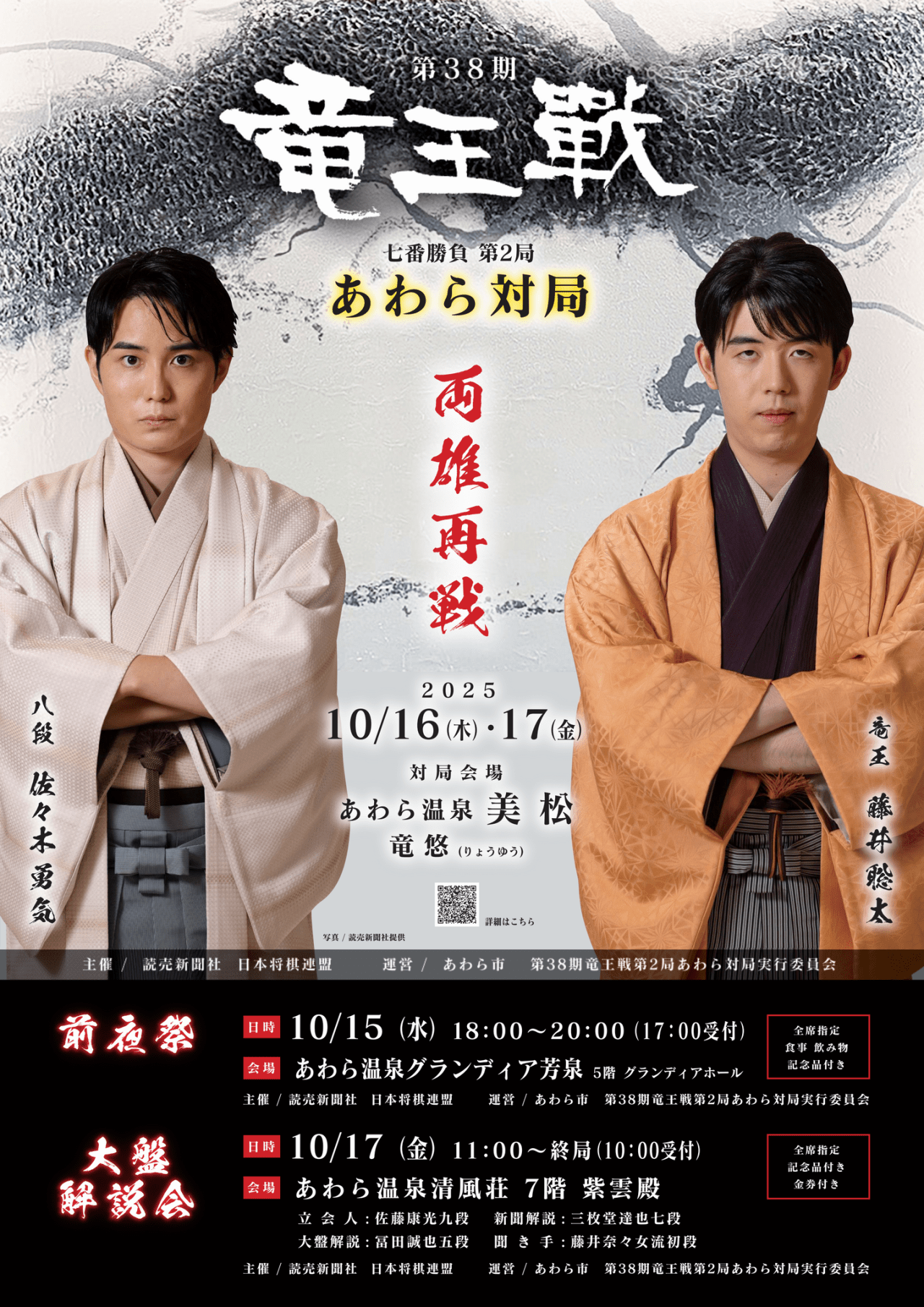 2025年10月16日・17日、あわら温泉美松にて、佐々木勇気八段が藤井聡太竜王に挑む注目の一戦。関連イベント情報や勝負めしも要チェックです!