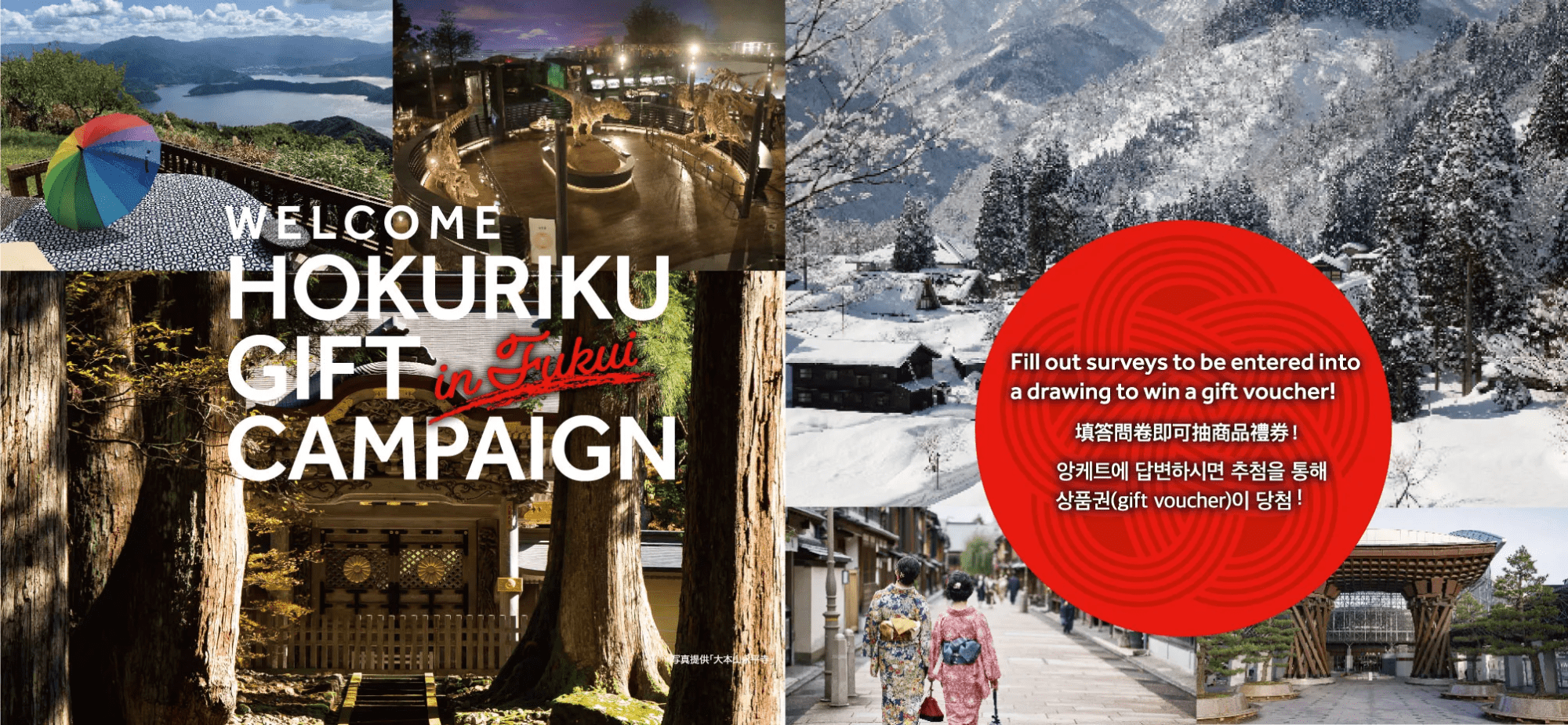 令和6(2024)年9月1日から福井県・石川県・富山県の北陸3県合同で、インバウンド観光客を対象としたWEBアンケート「WELCOME HOKURIKU GIFT CAMPAIGN」を実施し、令和7(2025)年1月1日からは「WELCOME HOKURIKU GIFT CAMPAIGN IN FUKUI」として福井県単独で実施しています。