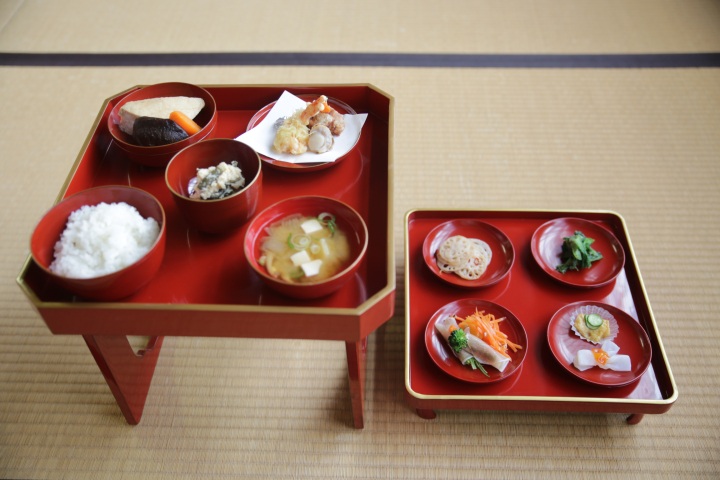 「うるしの里会館」内にある「椀椀(わんわん)」は、地元のおばちゃんたちが、地場産の食材を使用した体に優しいお料理を提供しています。料理の器はもちろんのこと、テーブルまで地元の越前漆器を使用しています。