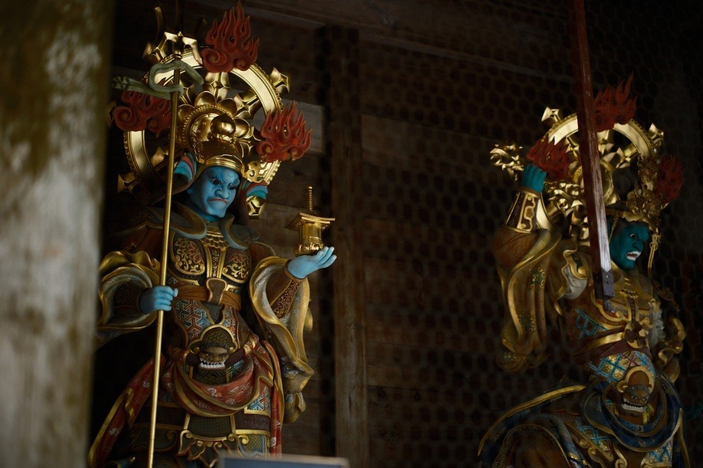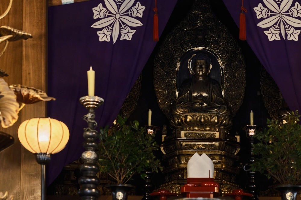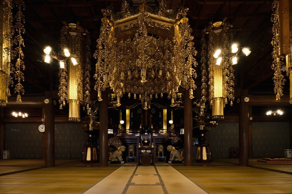In the center of the Butsuden, or Buddha Hall, the main hall where the principal object of worship is enshrined, is the Shakyamuni Buddha (the historical Buddha, the central figure of Buddhism), flanked on the right by the Maitreya Buddha (the future Buddha in Buddhist belief) and on the left by the Amitabha Buddha (the Buddha of Infinite Light, central to Pure Land Buddhism). The midday and evening services are held here.