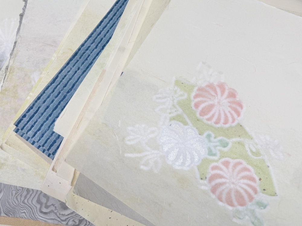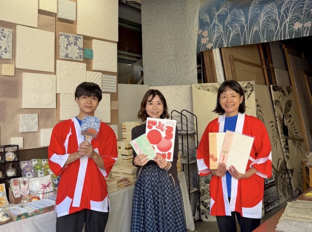 Located in Echizen City, 'Igarashi Seishi' is a long-established manufacturer of Echizen Washi (Traditional handmade Japanese paper) with a history of over 100 years. They handle a wide range of Washi products, primarily machine-made and hand-pressed Fusuma-gami (Paper for traditional sliding doors), as well as wallpapers and small items with varying thicknesses, patterns, and colors. Among their offerings, the large-scale creative hand-pressed Washi created by Dento Kogeishi (Certified Traditional Craftspeople)—who have evolved traditional techniques into modern forms capable of both flat and three-dimensional expression—is truly breathtaking. (This photo was taken during the 'RENEW2025' open factory event.)