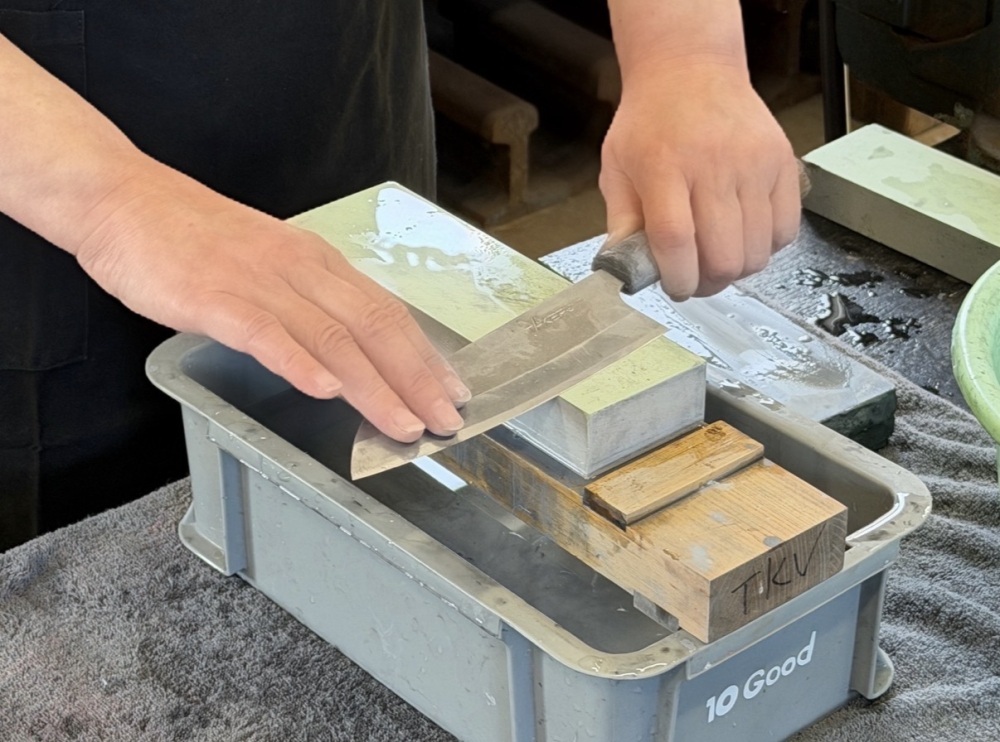 Among the various experiences available, we introduce the popular "Ryoba-togi (Double-edged sharpening) Experience (6,000 yen)." Artisans provide careful guidance while watching your technique, so even beginners can participate with peace of mind. As you carefully slide the blade over the Toishi (Whetstone) and polish it bit by bit, you can see the appearance of the metal transform and its brilliance increase before your eyes.