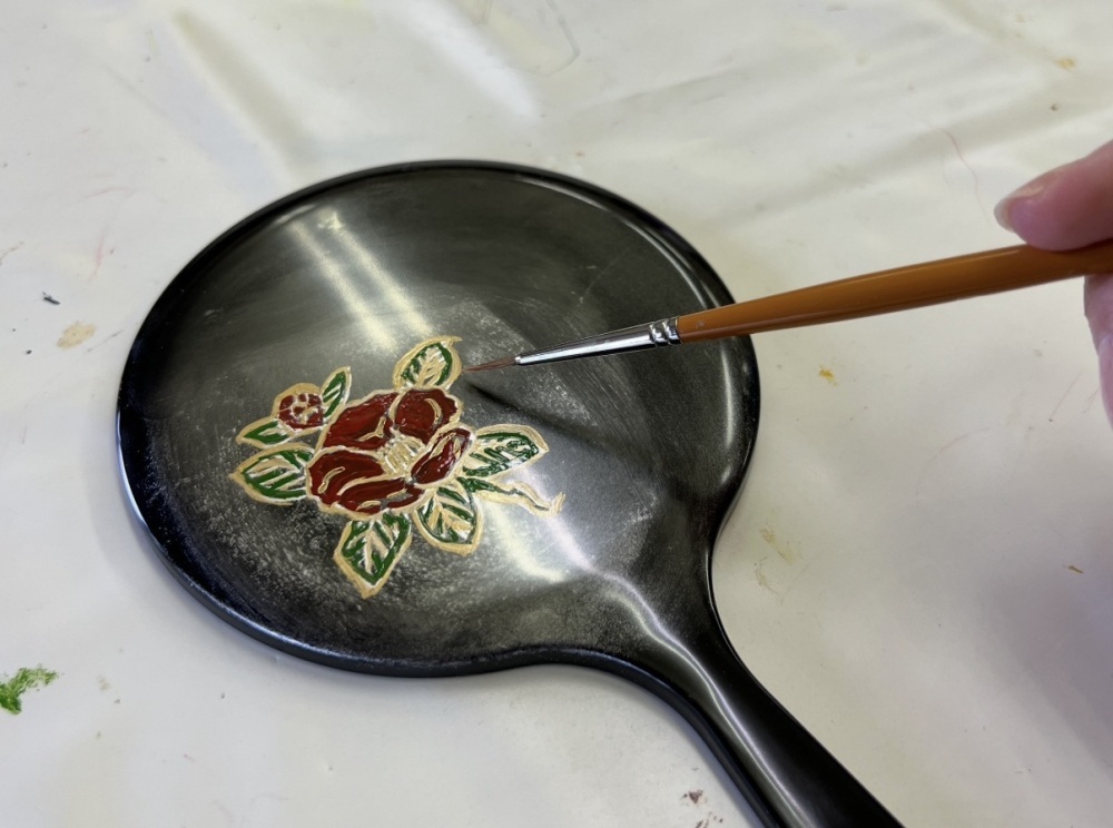 In the "E-tsuke (Decorative hand-painting) Experience (2,200 yen)" workshop, you can choose one favorite item from various lacquer accessories such as bowls, trays, or hand mirrors. This time, we chose a hand mirror. The freedom of expression is part of the appeal, allowing you to trace designs from templates or draw original illustrations. During the experience, an artisan provides a detailed lecture on the process. Spending about an hour focusing on painting—refining lines and applying colors to enhance the luster of the lacquerware—is a truly luxurious time.