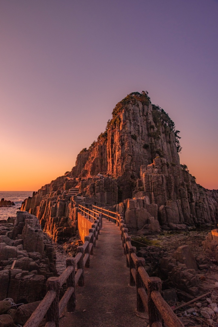 Driving northwest to the coastal city of Sakai, you can find rare examples of columnar jointing. This striking geological phenomenon occurs in cooling lava flows and produces outcrops of polygonal columns. Tojinbo Cliffs are a series of cliffs made of these dramatic columnar formations. From the cliffs, you can see the striking red pedestrian bridge that connects Oshima Island to the mainland. The densely forested, uninhabited island has a shrine and lighthouse, along with stone paths that provide routes for exploration. It too has outcrops of columnar jointing, best viewed from the bridge.