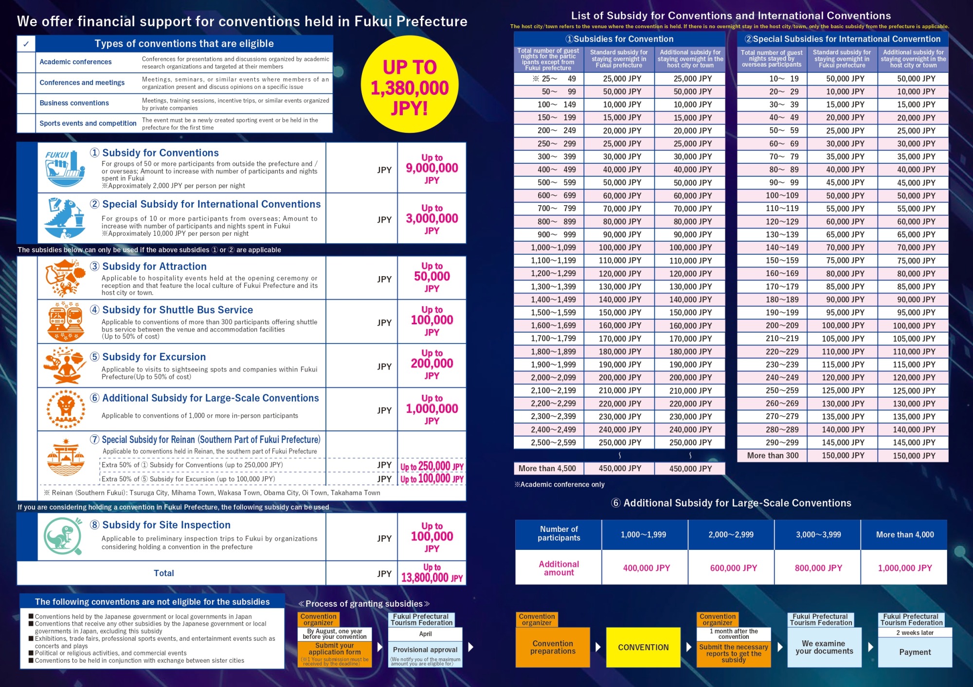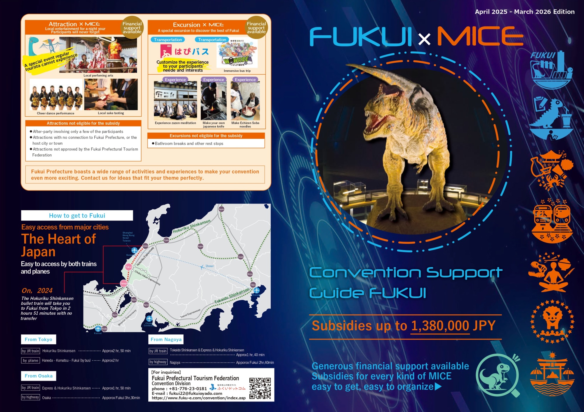 Fukui offers some of the most generous financial support in Japan to help you put together conventions, incentive travel (company trips, etc.) or Meetings, Incentives, Conferences, and Exhibitions (MICE) in the prefecture. You could get up to 13,800,000 JPY!