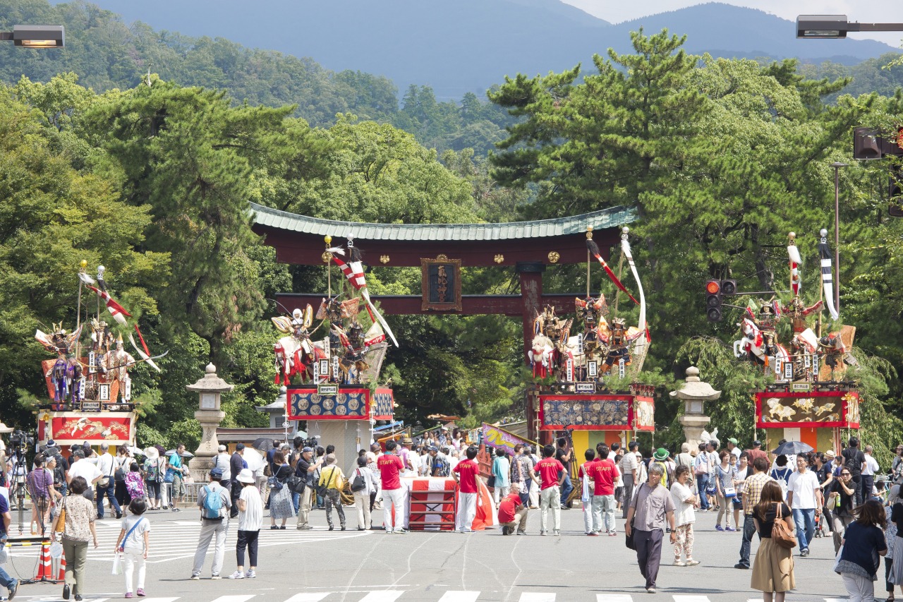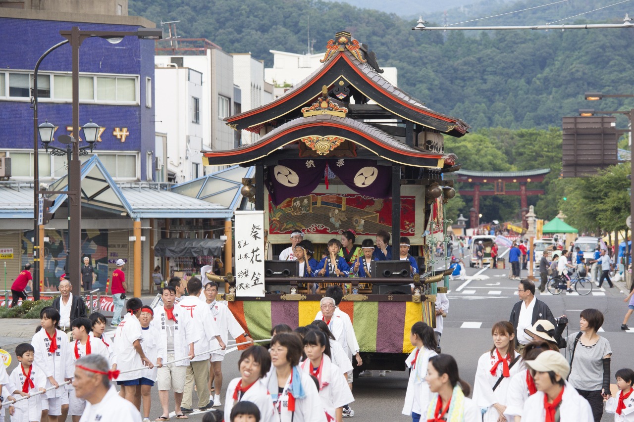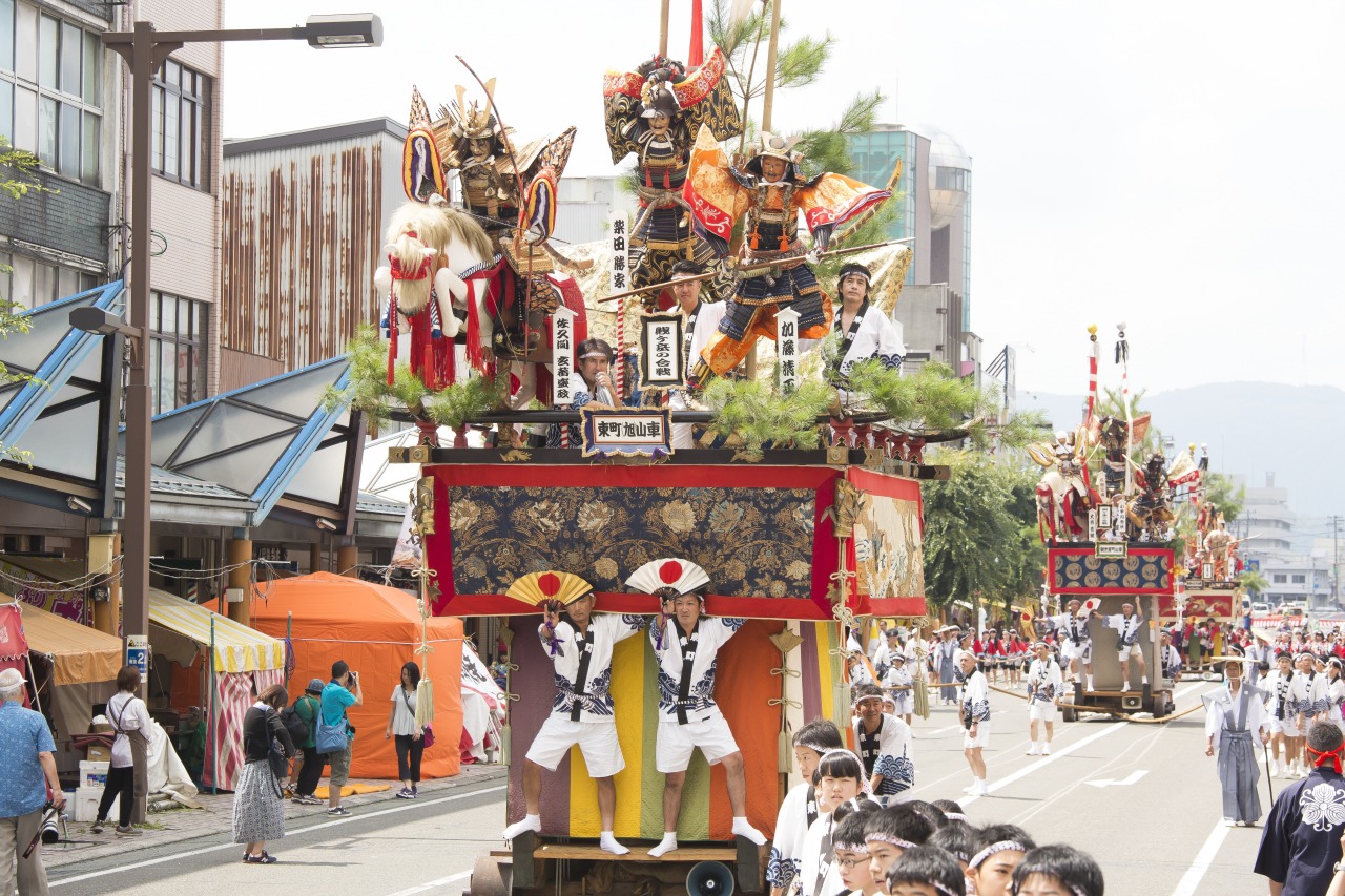 2日の宵山祭は例祭の前夜祭にあたり、宵山巡行がないと本祭りは始まらないと言われています。「宵山」という山車の上で、子供達が踊りを奉納し、笛や太鼓などの賑やかなお囃子と共に市内を巡行します。