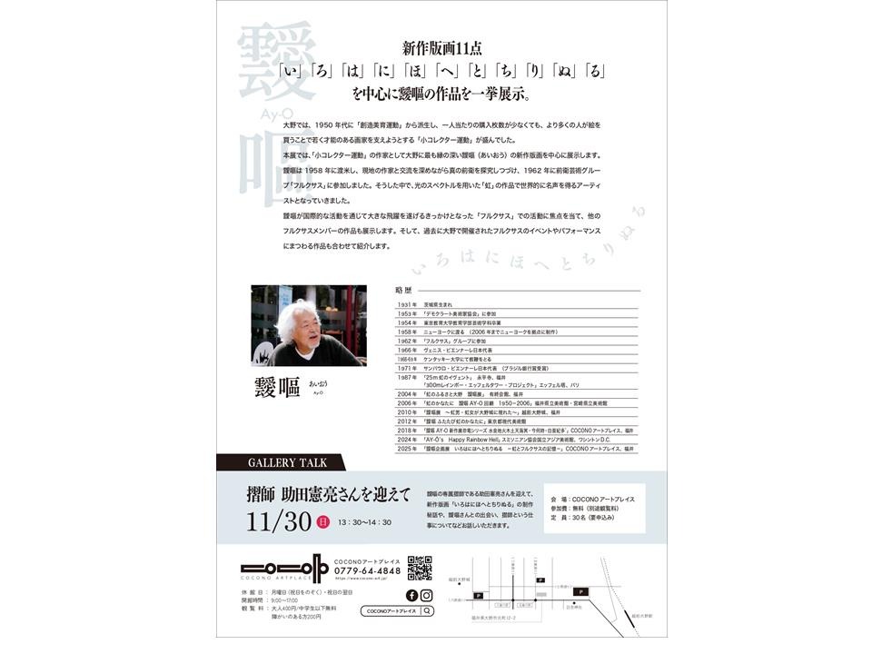 靉嘔の専属摺師である助田憲亮さんを迎えて、新作版画「いろはにほへとちりぬる」の制作秘話や、靉嘔さんとの出会い、摺師という仕事についてなどお話しいただきます。