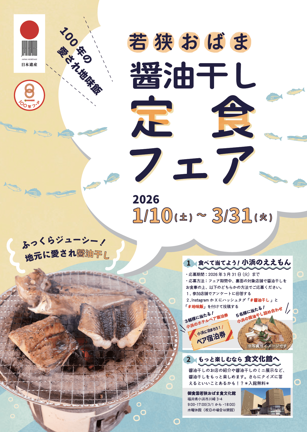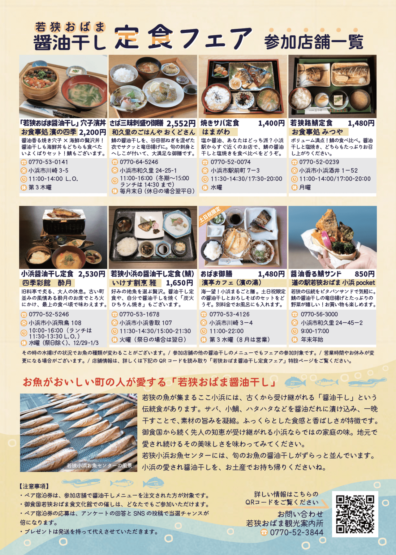 ・応募方法:小浜市内の対象店舗で「醤油干し」メニューを食べて、店内にあるQRコードでアンケートに答える、または、Instagram・Xにハッシュタグ「#醤油干し」と「#地味飯」を付けて投稿する。