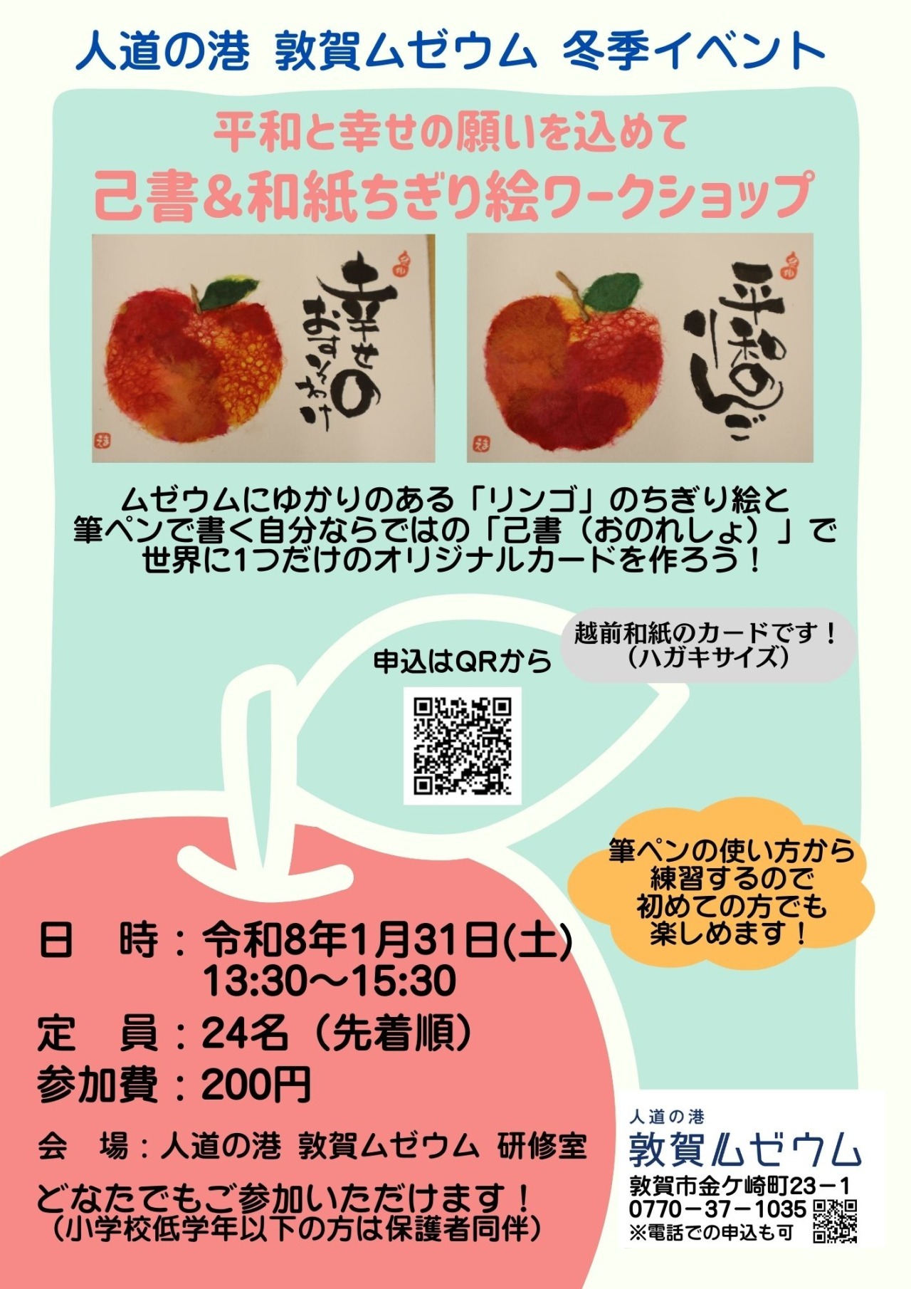 ムゼウムにゆかりある「リンゴ」のちぎり絵と筆ペンで書く自分ならではの「己書(おのれしょ)」で世界に1つだけのオリジナルカードを作ろう!