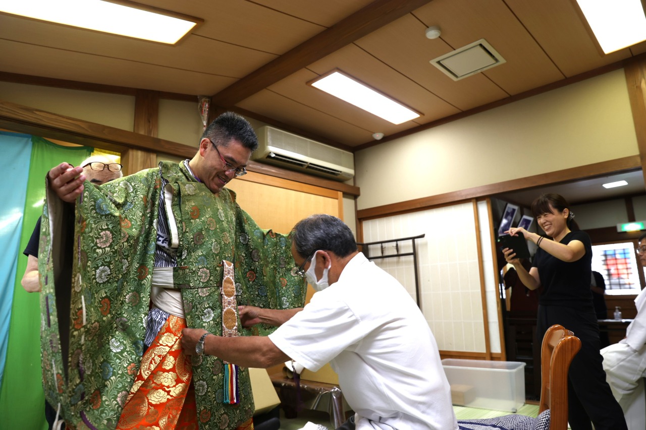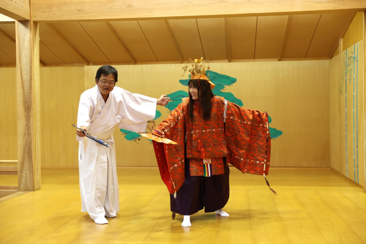 衣装を着装した後は、簡単な所作の指導も受けられます。能面を付けたときの視野の狭さや、重い衣装を着て舞うことの難しさなど、能役者にならないと分からない大変さも実感できるでしょう。