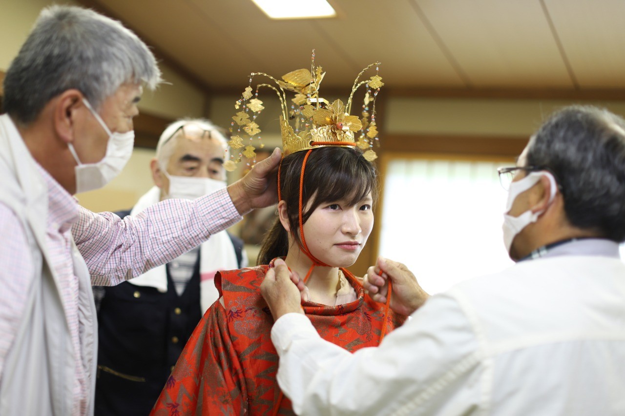 池田町が誇る伝統芸能「水海の田楽・能舞(国指定重要無形民俗文化財)」で使われていた衣装を身に着け、記念撮影ができます。(カメラは持参)