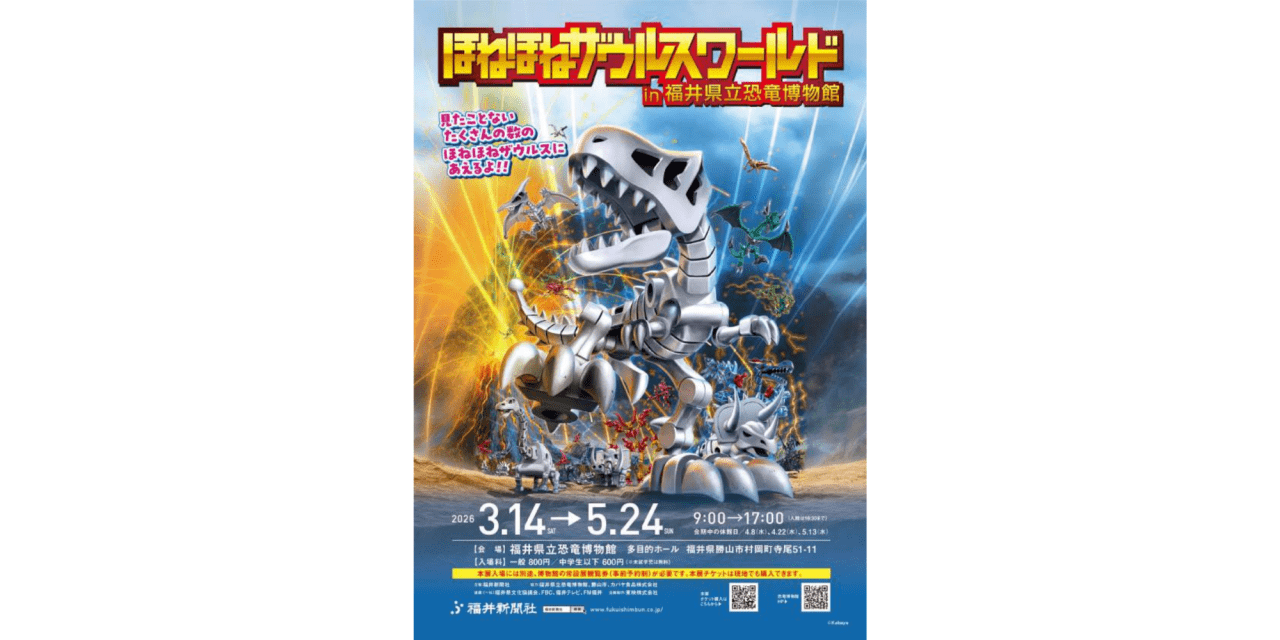 ほねほねザウルスは、「ほね」「恐竜」のユニークなデザインで、組み換え自由なプラキット。パーツをつなげたり、合体させたりして、自分だけの「ほねほねザウルス」をつくることができる。2002年7月の発売以来、たくさんの子どもたちが「ほねほねザウルス」の世界を想像いっぱいに楽しんできました。発売25周年を記念して「ほねほねザウルス」の世界を大きくひろげた初めての展覧会を福井県立恐竜博物館で開催します。