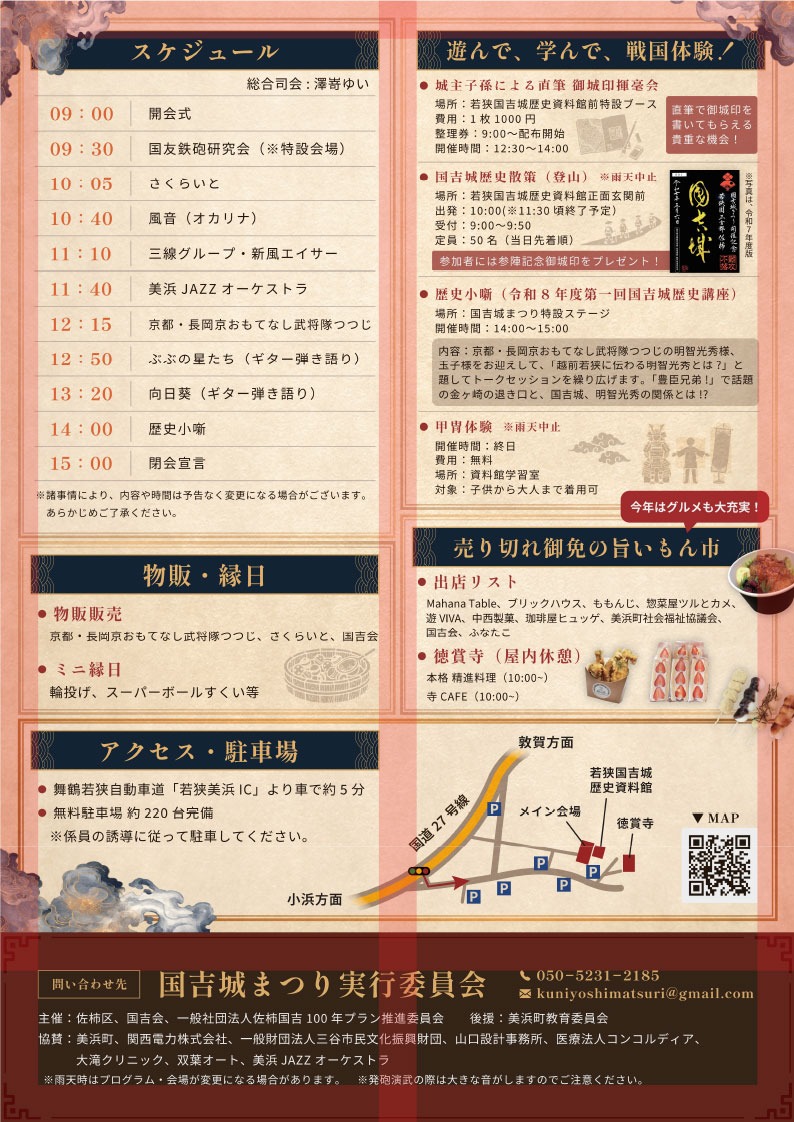 令和8年5月5日(火・祝)に若狭国吉城歴史資料館周辺で「令和8年国吉城まつり」を開催します。信長・秀吉・家康が入場した、難攻不落の城で戦国を体験。大人も子どもも楽しめる戦国イベントです!