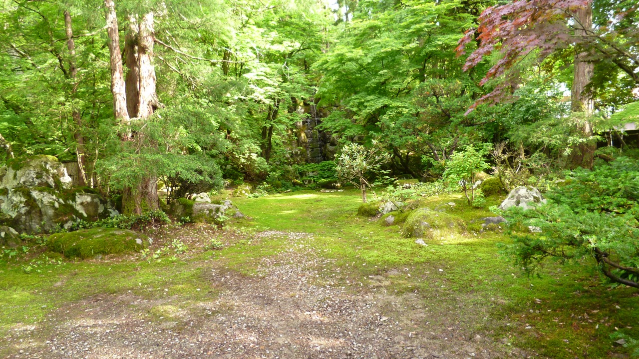 庭園には池や滝組、中島、石橋、飛石などが配され、スギ・アカマツ・モミなどの老木が林立し、山の借景もあいまって、壮大で幽玄な趣が感じられます。