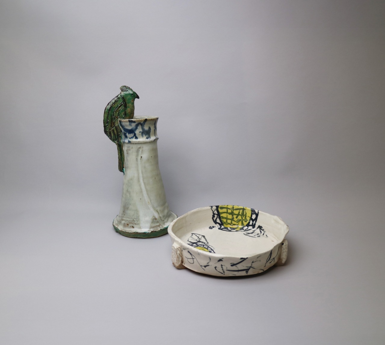 宇野陶房が自然をテーマに制作した絵付け作品と共に、