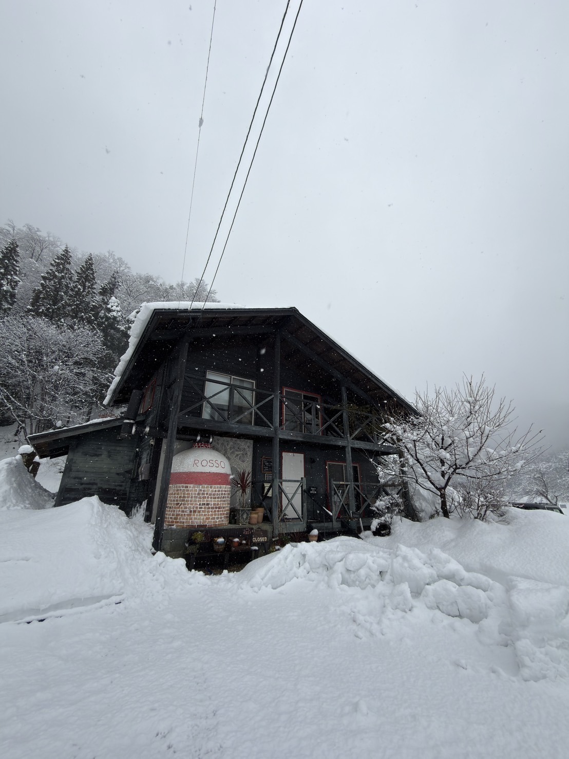 真っ白な風景の中で、店名由来の赤く塗られたピッツァ釜が、温かみを放っていた。