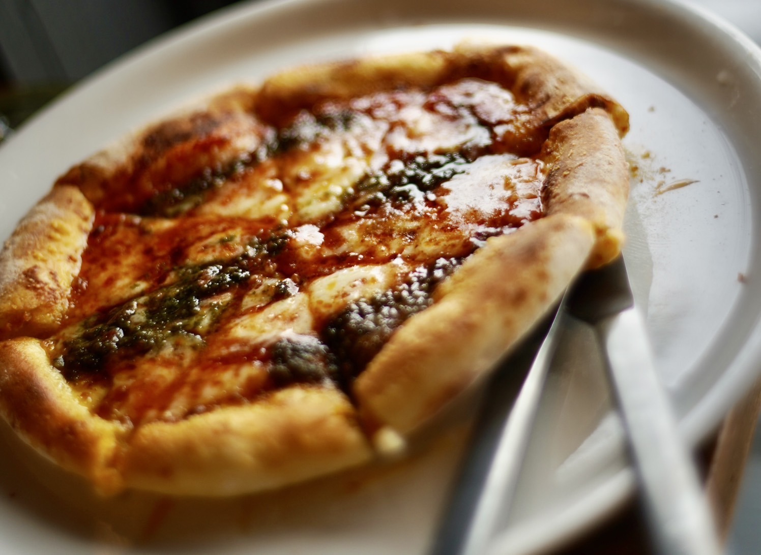 香ばしく、生地の力強さを感じるピッツァで、小さくとも食べ応えがある。