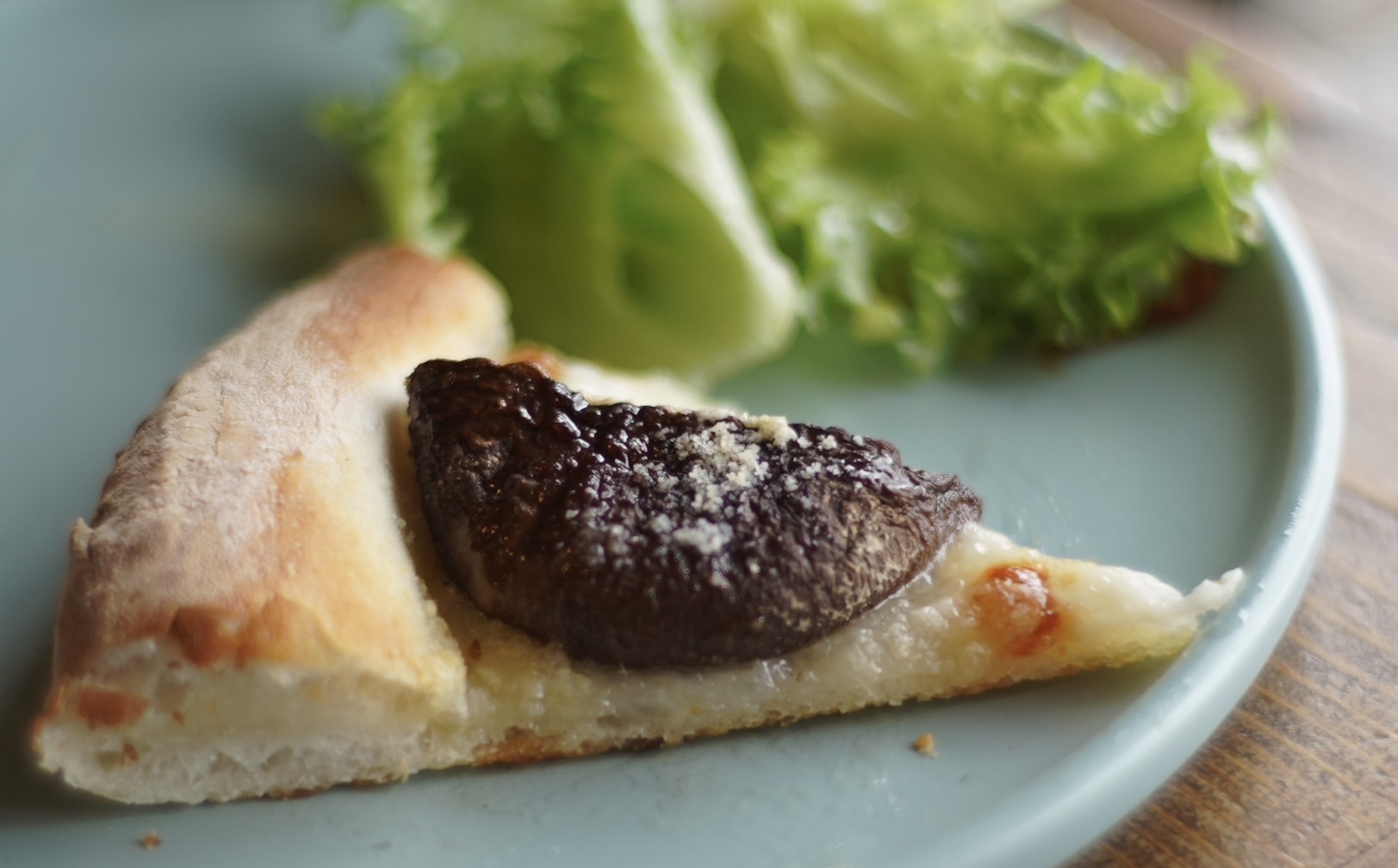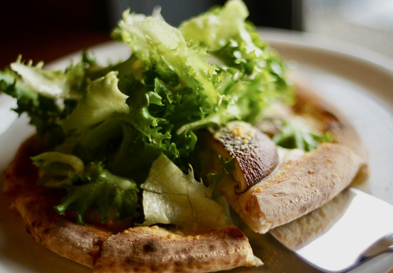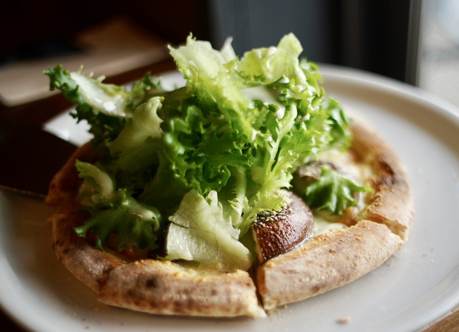 上には、グリーンリーフが山と盛られ、生地の上にはチーズと分厚い椎茸が乗せられていた。