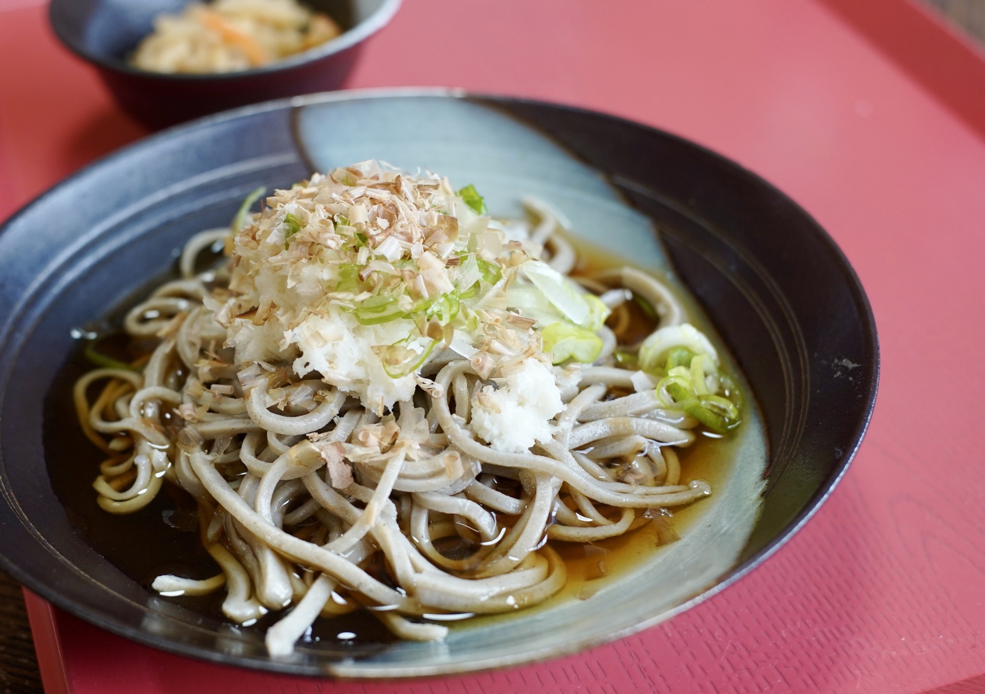 おすすめの料理は、郷土料理九品とご飯、おろしそばがセットになった「土の駅Aセット」である。