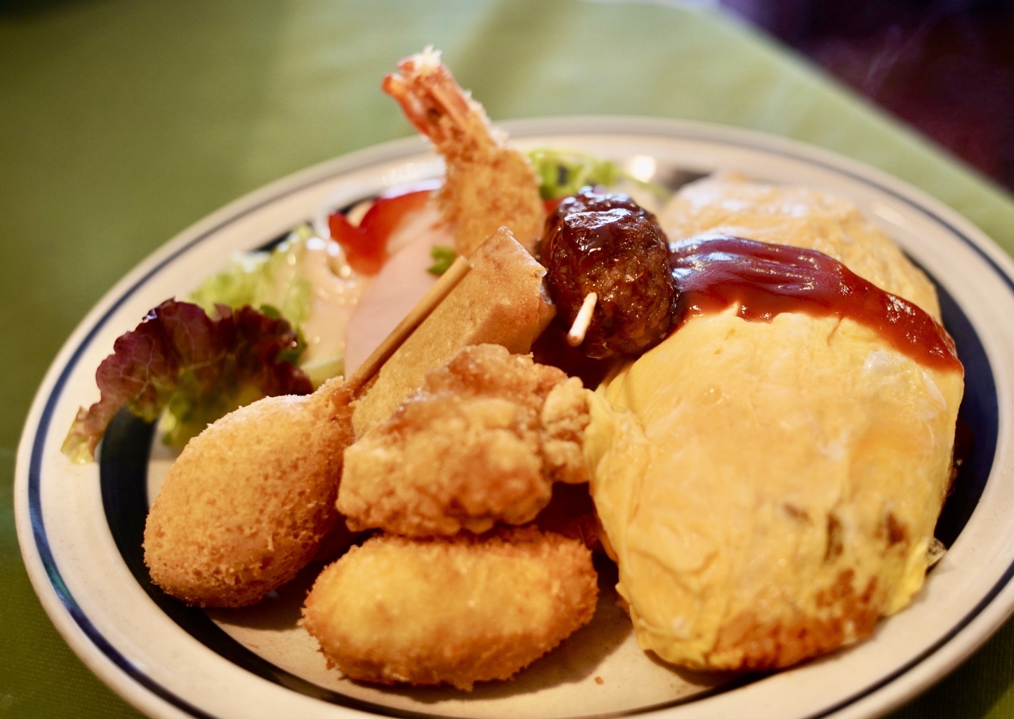 皿の上は壮観、オムライス、アメリカンドッグ、ミートボール、エビフライ、海老クリームコロッケ、春巻、唐揚げに、ハムとポテトサラダ、サラダと、もはやテーマパークである。