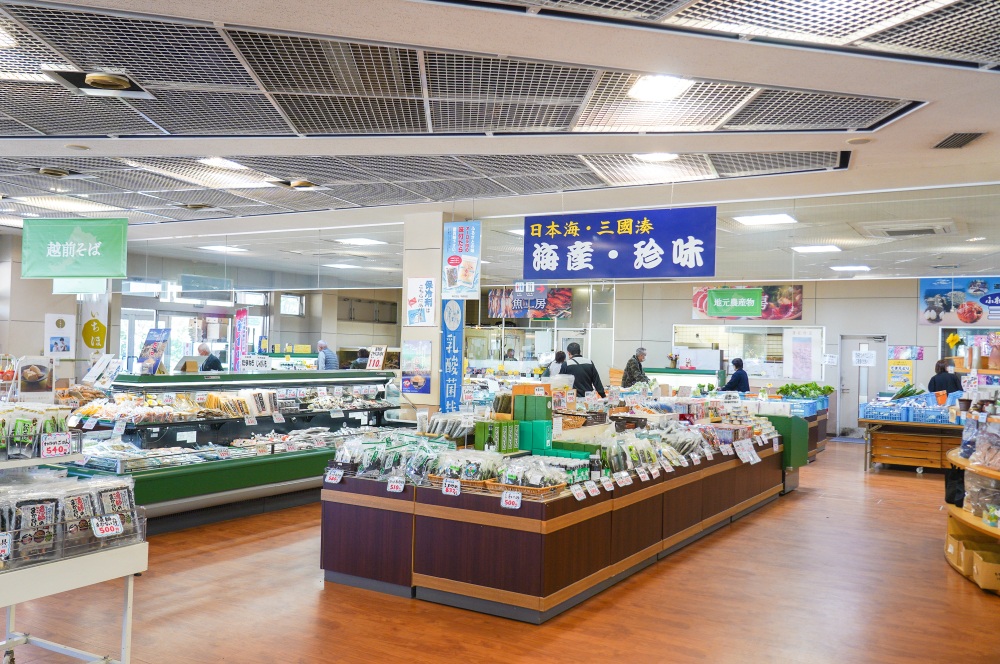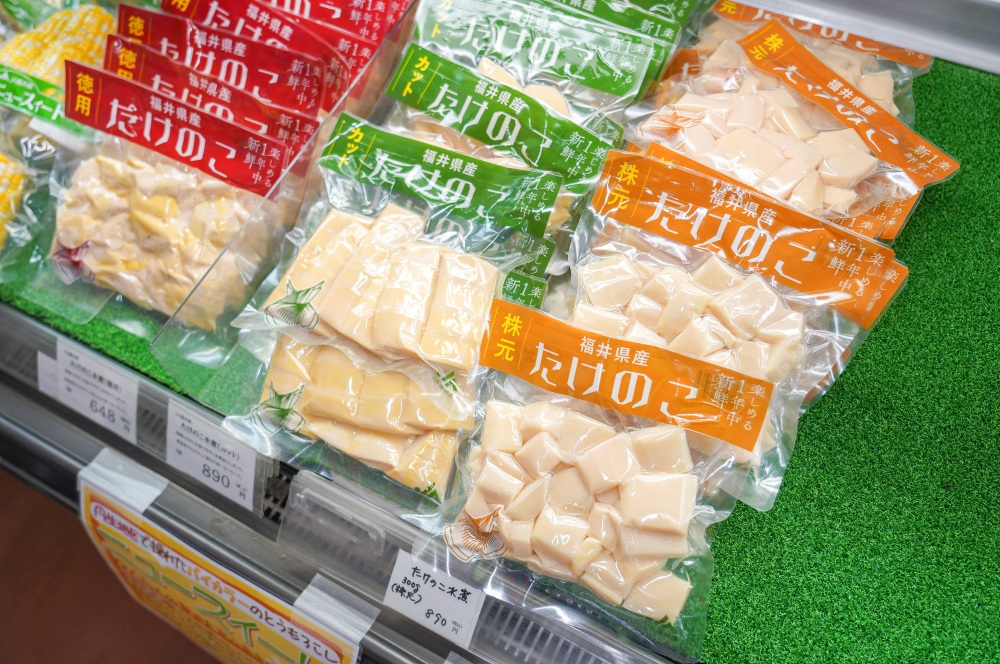 春は宮﨑村のたけのこ、夏は越前ニュースイートコーン、秋は香り豊かなきのこ類、冬は越前かになど、四季を通してここならではの有名な農産物を手に取ることができます。特にたけのこやコーンなどは、どのタイミングで訪れても、旬の食感がそのまま真空パックされた商品を手に取ることができるのも嬉しいポイント。