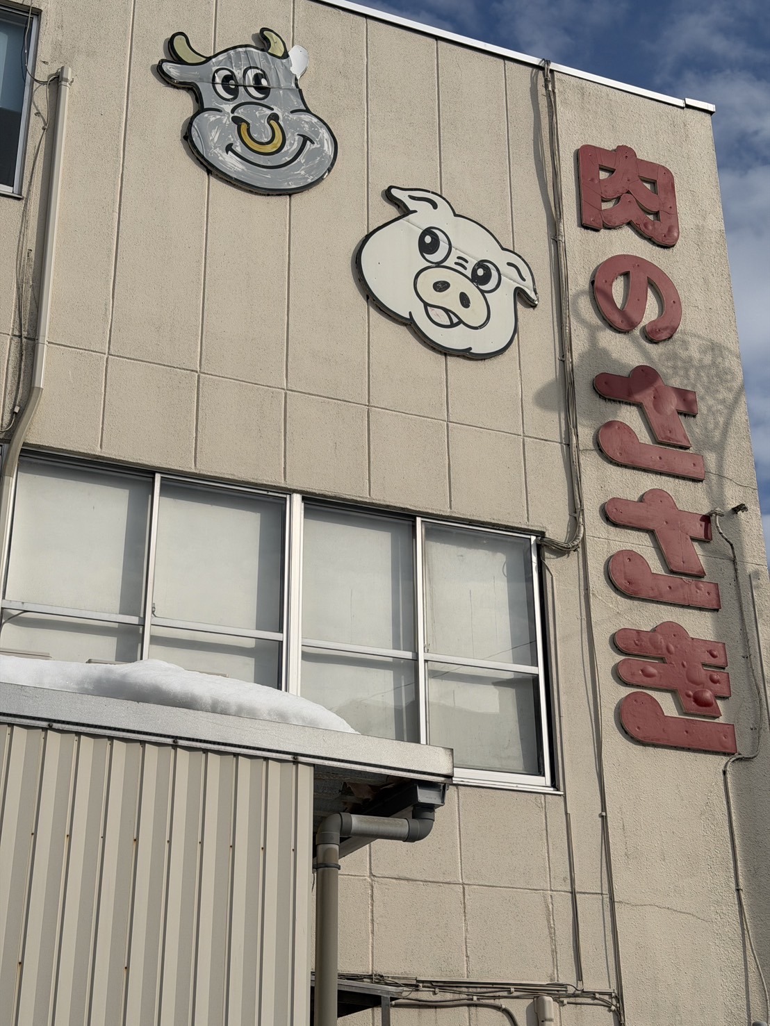 ビルの壁面には、かわいい豚と牛のイラスト。