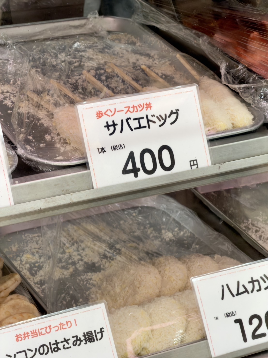 「ミートデリカササキ」という精肉店で販売されている「サバエドッグ」。