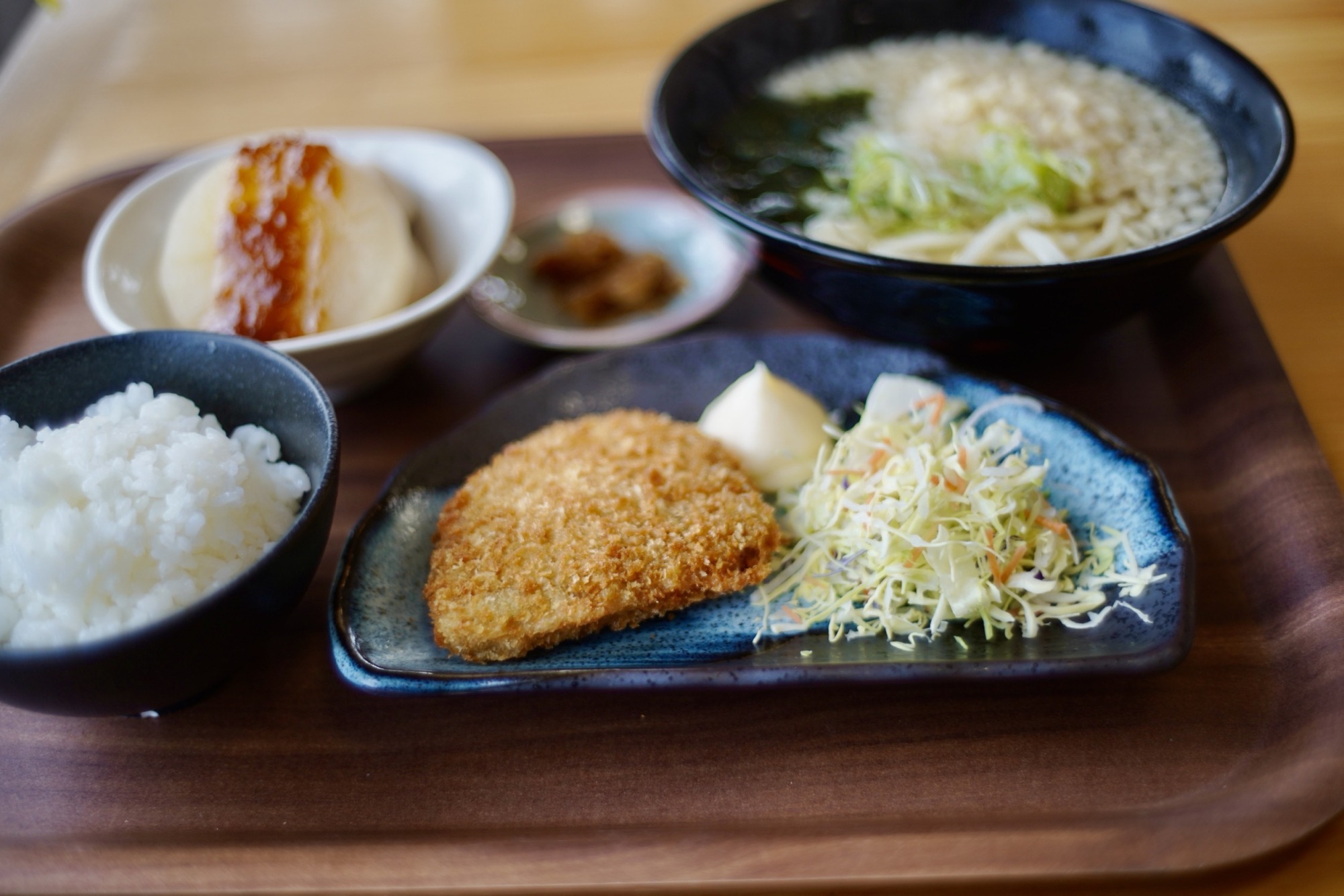 メインは、優しい甘みが心を和ませるかぼちゃと人参のコロッケ。そこにたぬきワカメうどんとお新香、ふろふき大根と里芋がついた定食である。