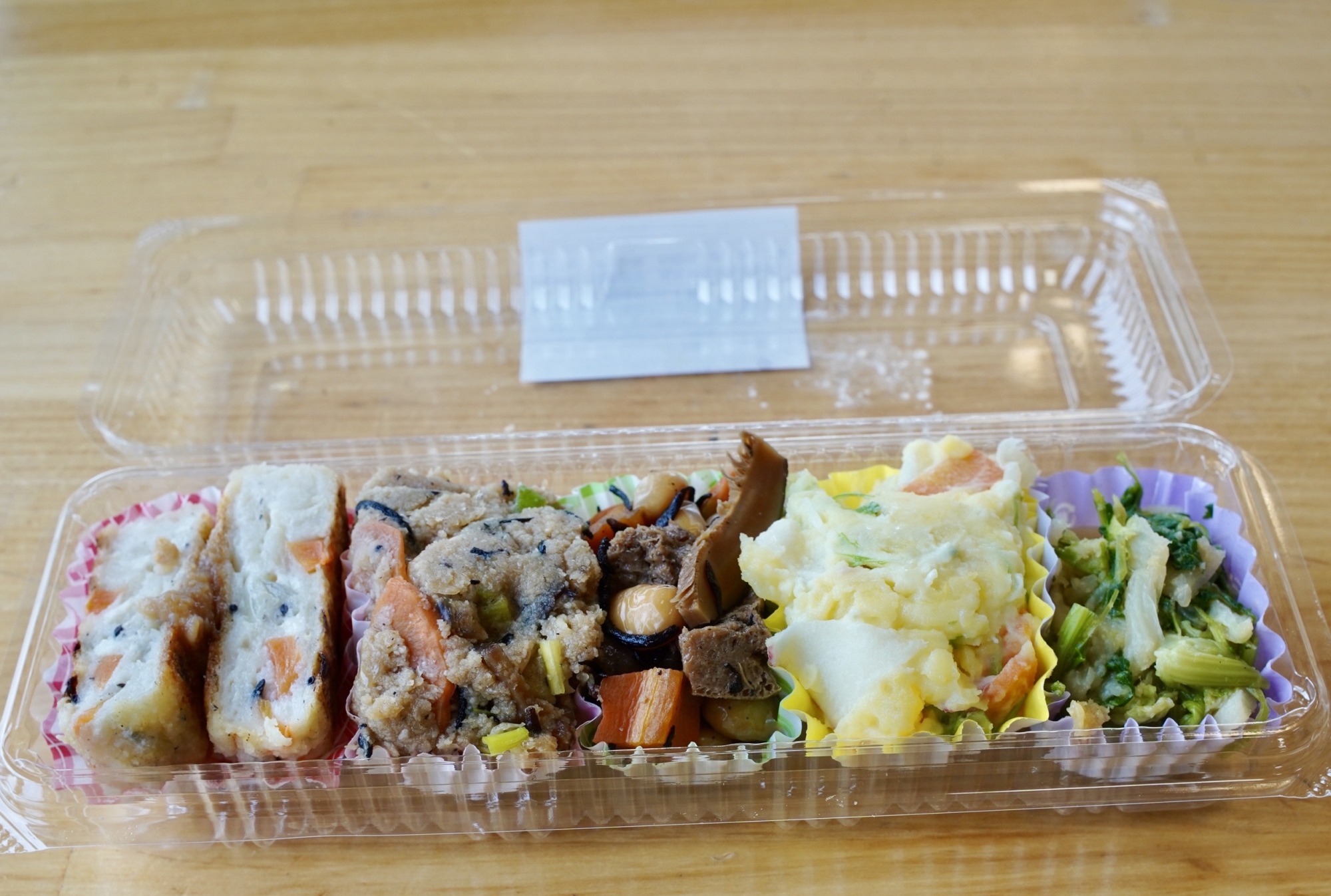里芋のころ煮、おから、五目煮、ポテトサラダなどである。食べていると、親戚のおばあちゃんの家でご馳走されているような、温かい気分になる。
