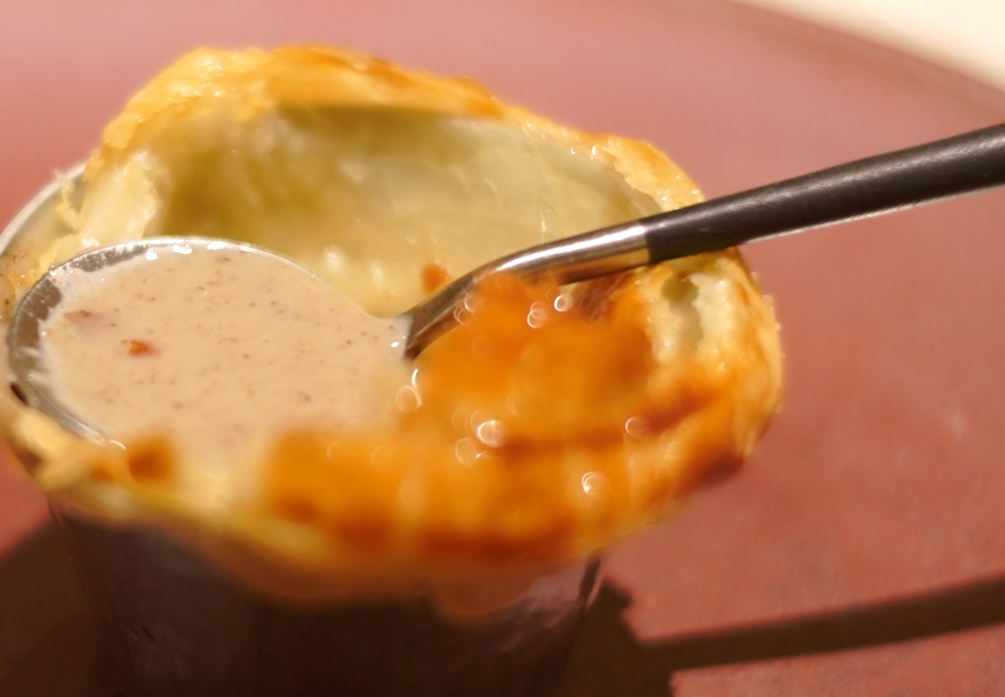 パイを割ると、きのこの香りがふわりと立ち上がり、顔を包む。