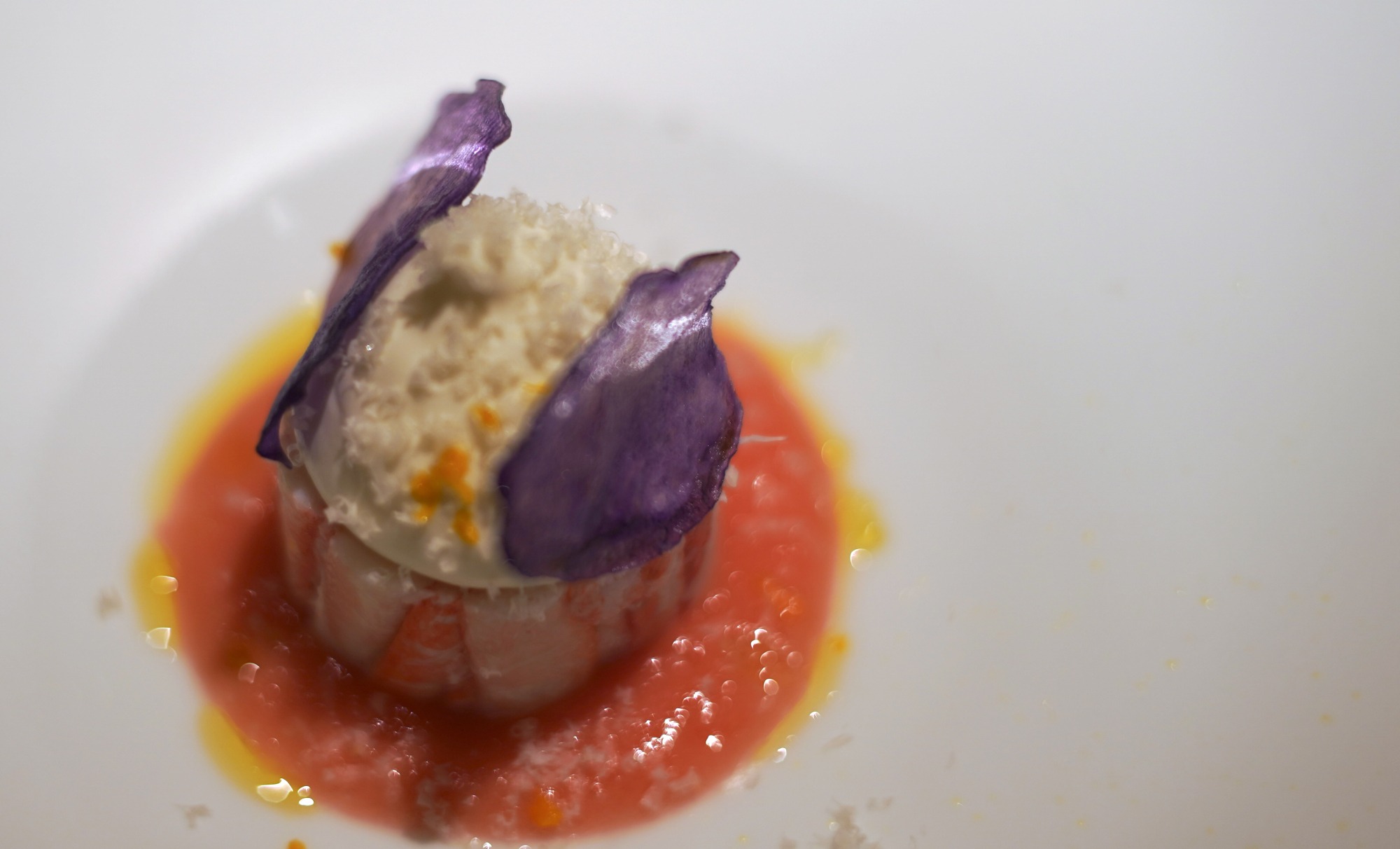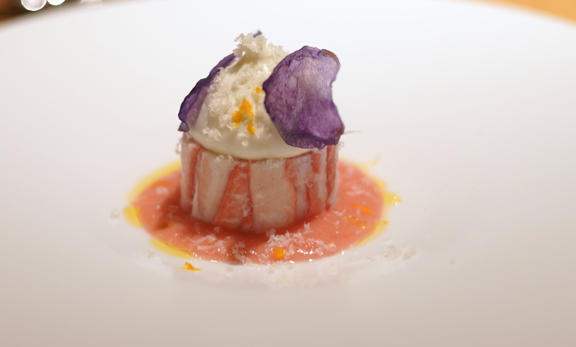 ズワイガニでかたどった円筒の上にかぶのムースが盛られ、振り柚子が香る。