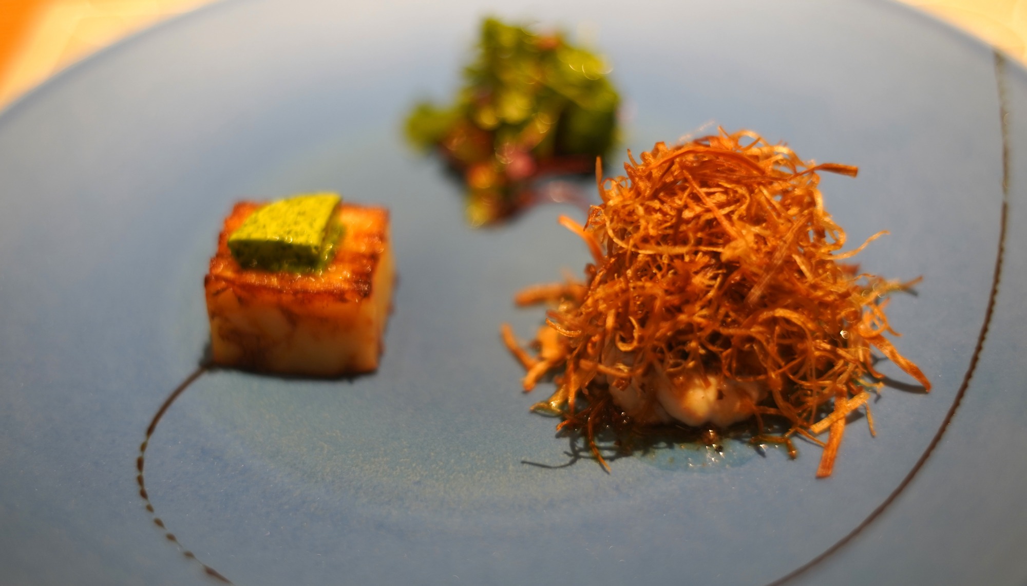 右手の皿では、焦げる一歩手前まで揚げたネギの中に白子が忍び、下にはトリュフの微塵切りが隠れている。