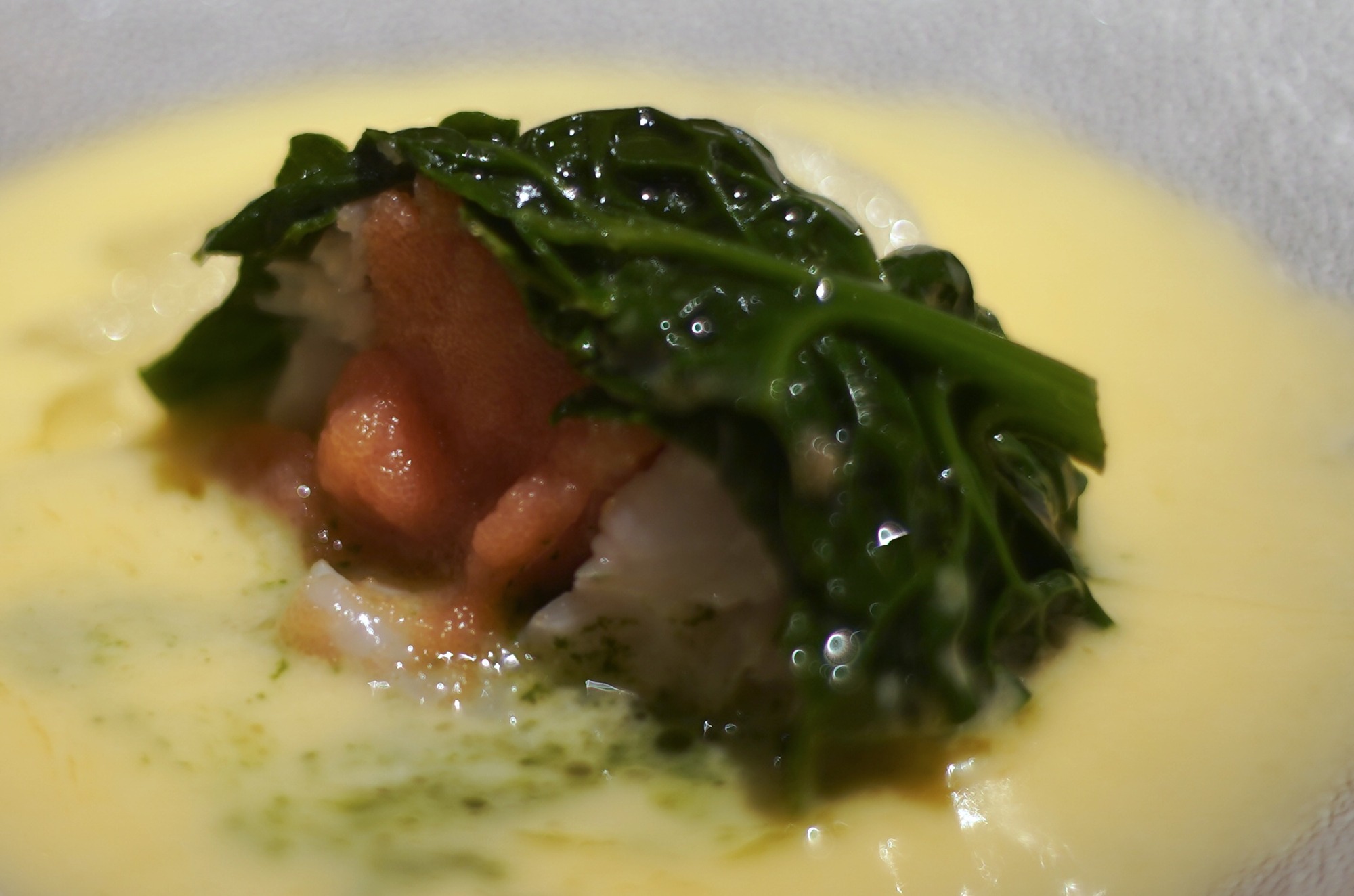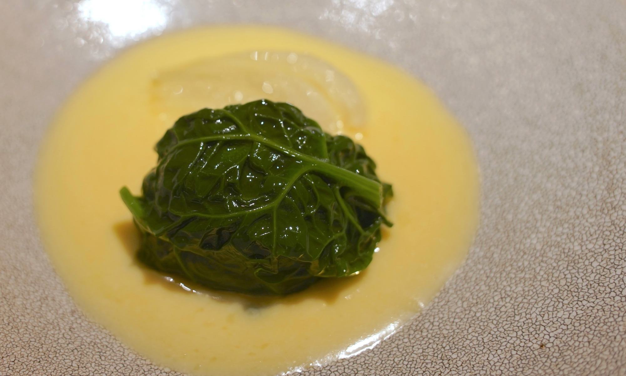 「若狭カレイのアラヴァプール 縮みホウレン草をまとわせて」