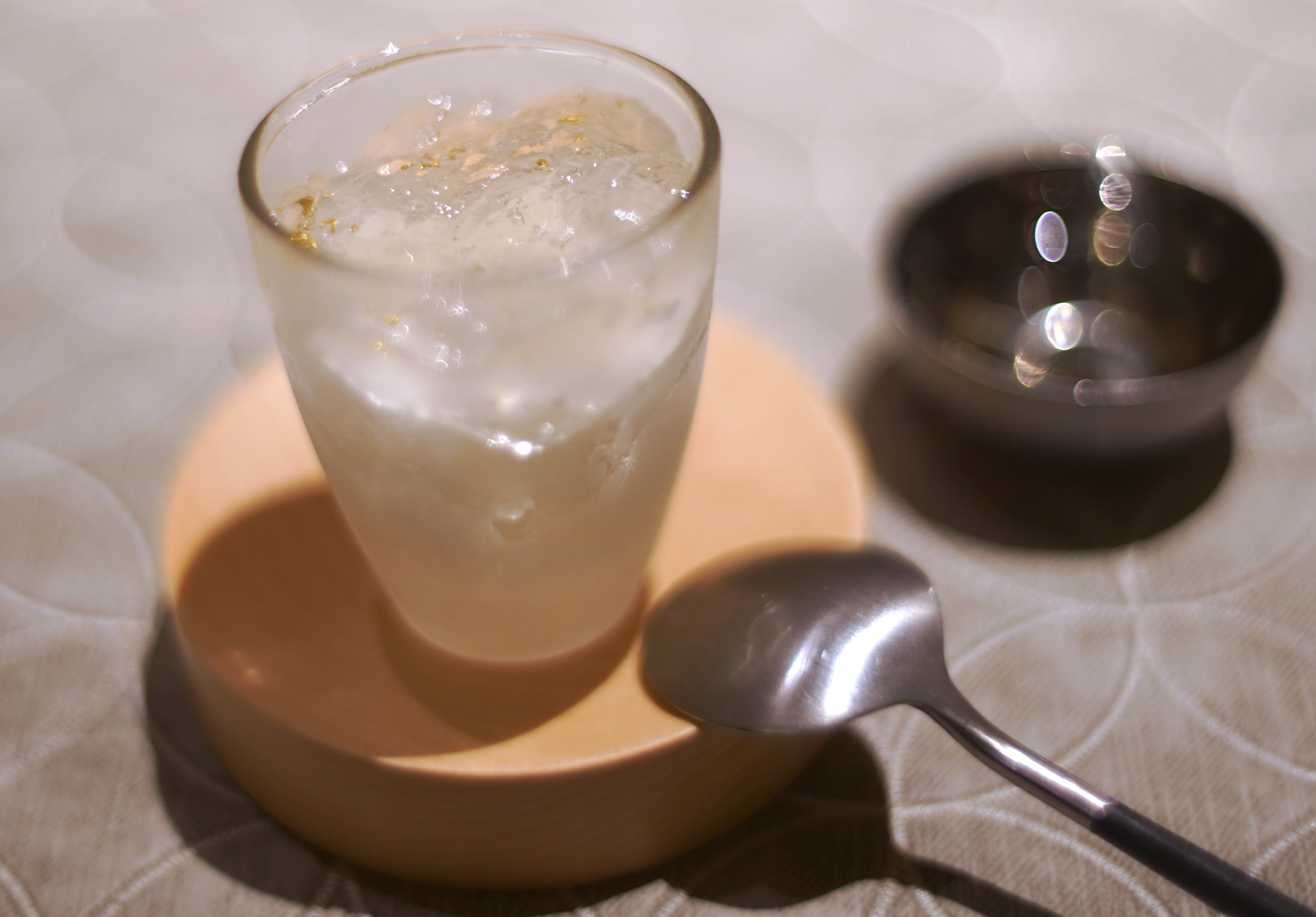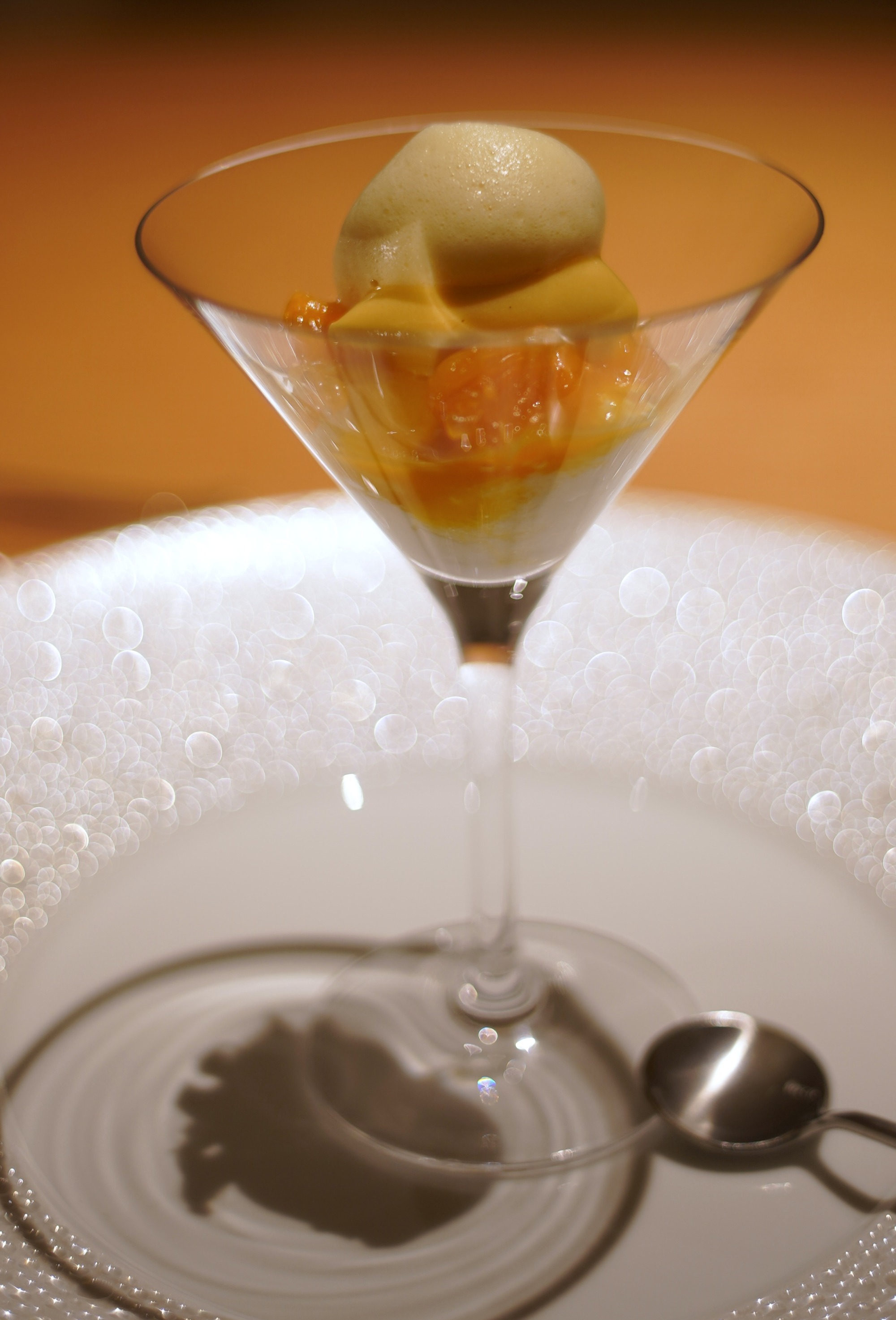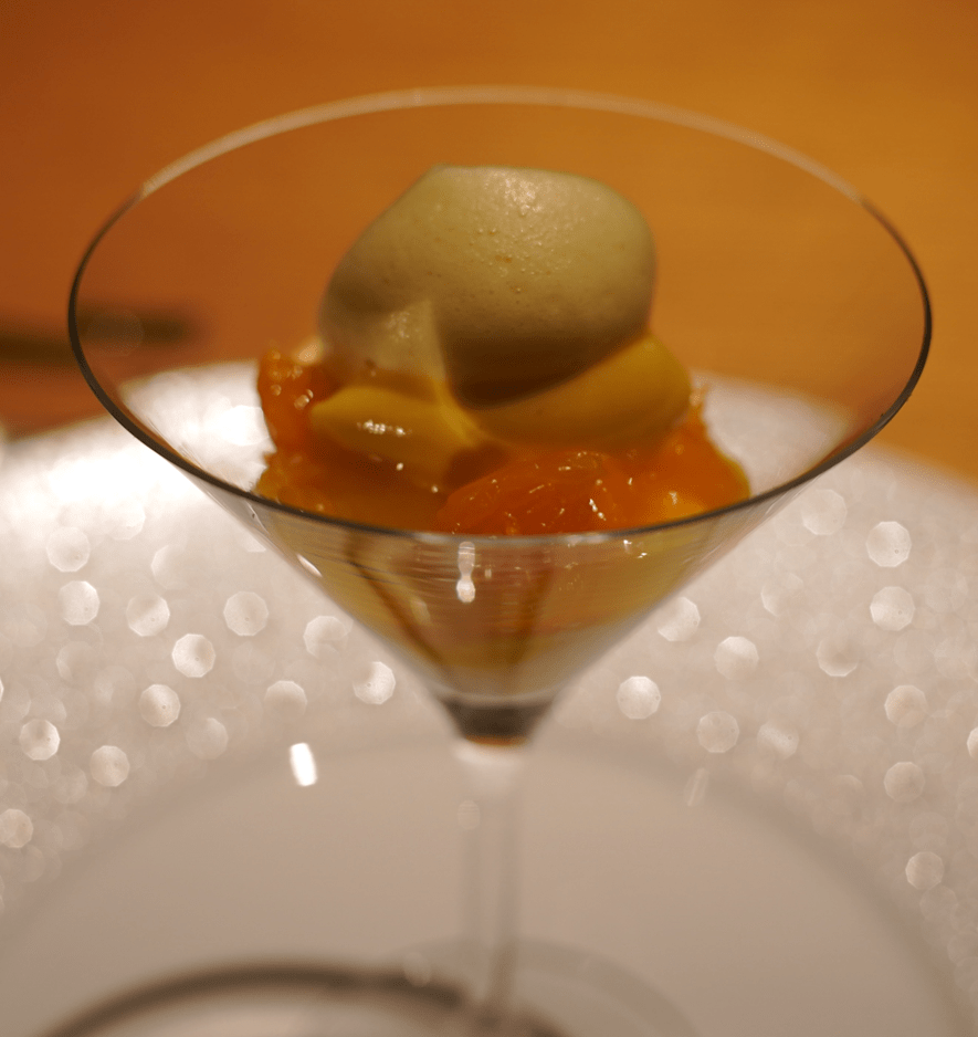 カクテルグラスに重ねられ、下からジャージー牛のパンナコッタ、清見オレンジ、パッションフルーツ、黄金梅の泡の構成。
