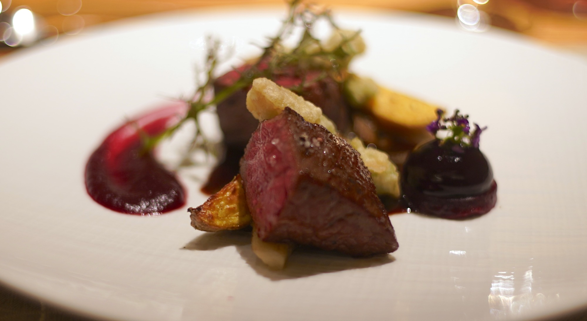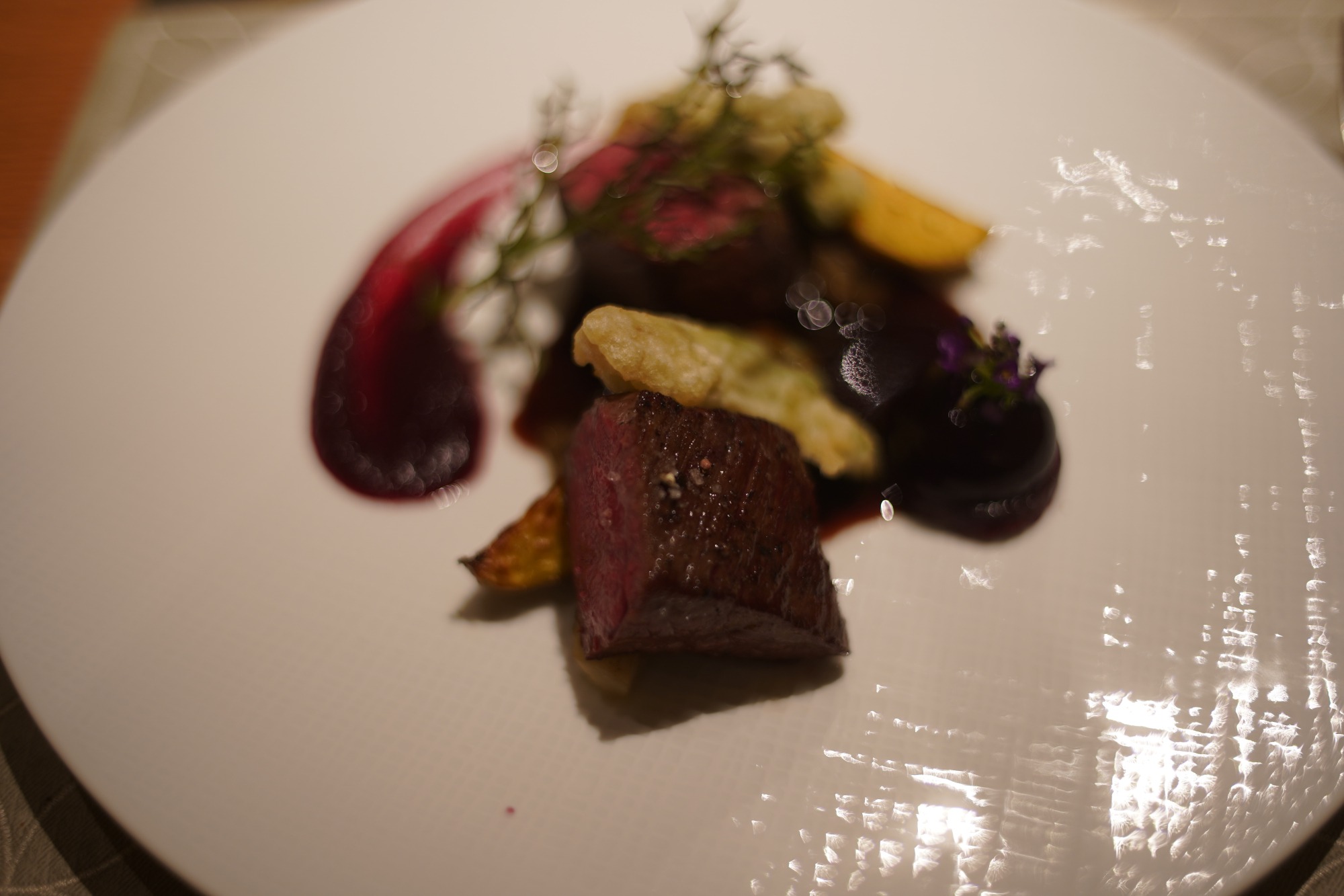 「厳選国産牛フィレ肉の炭火焼き ビーツと果実のピュレ シンプルなボルドレーズソースで」