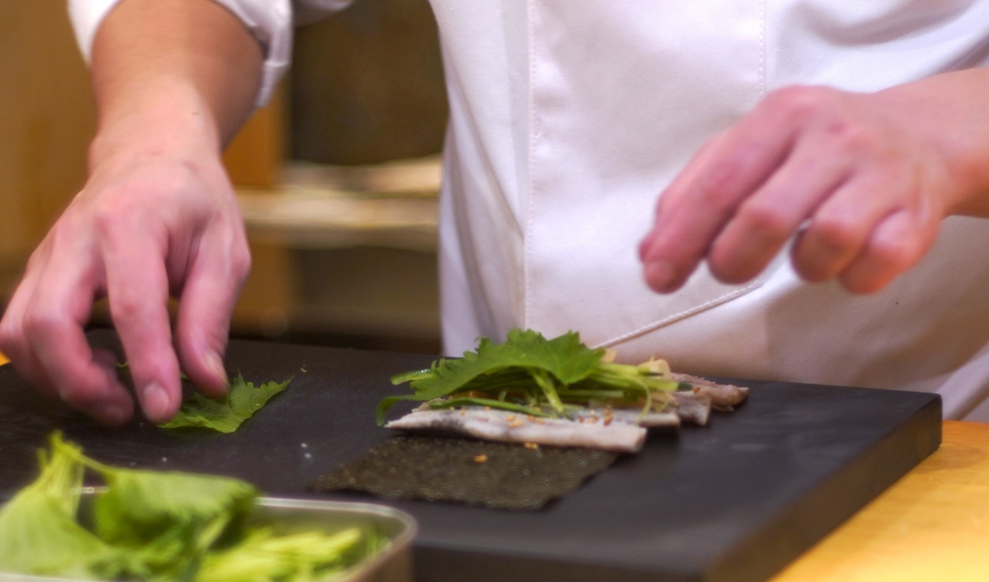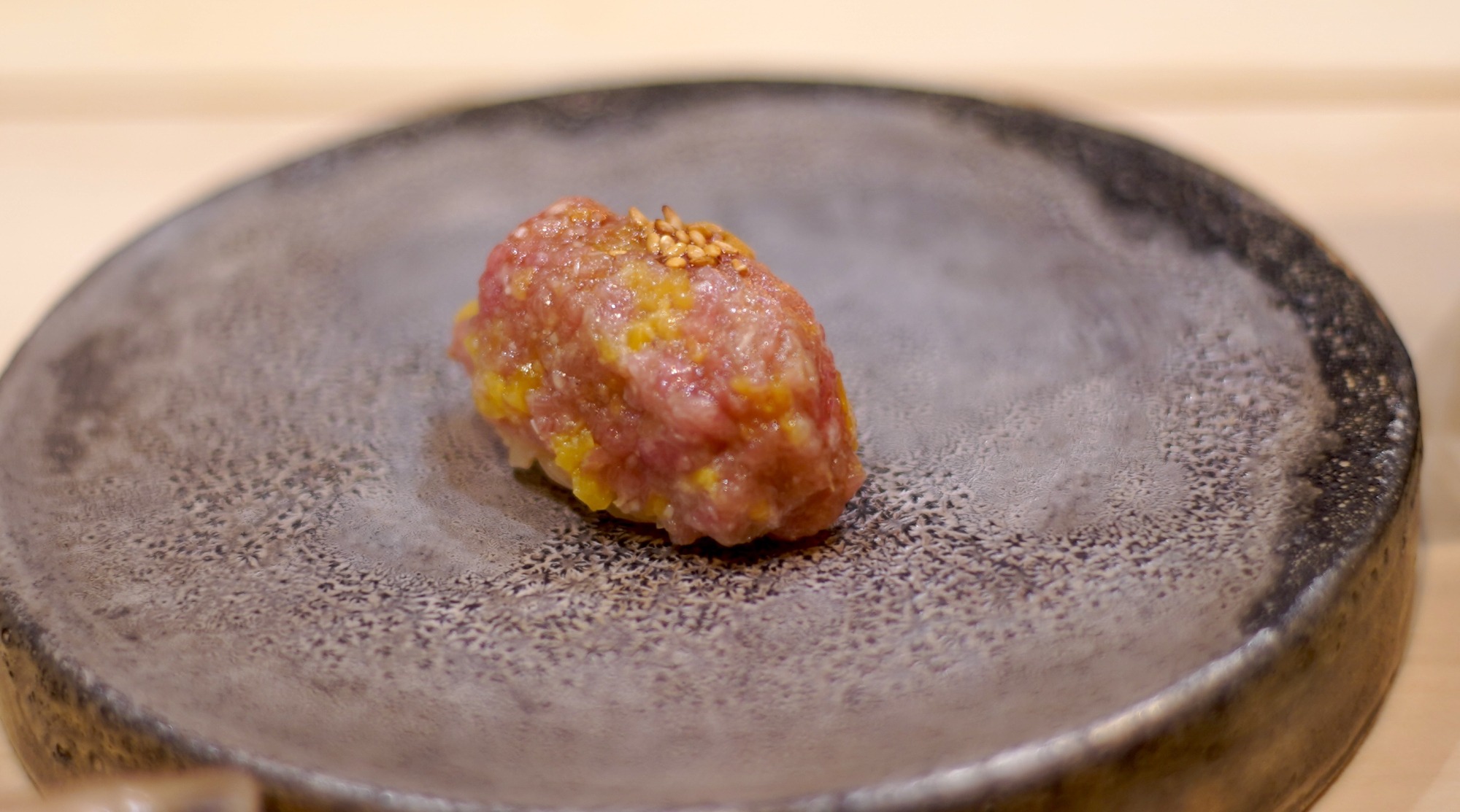 塩とネギを合わせたマグロ中落ちの握りは、天に少しかけたゴマの香りがアクセント。