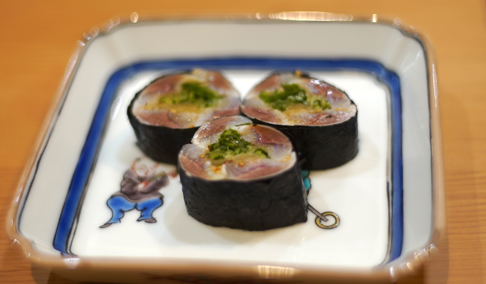 イワシは細かく切ったガリと大葉、生姜、胡麻を適量一緒に巻いており、脂が乗ったイワシと薬味の出会いが絶妙だ。