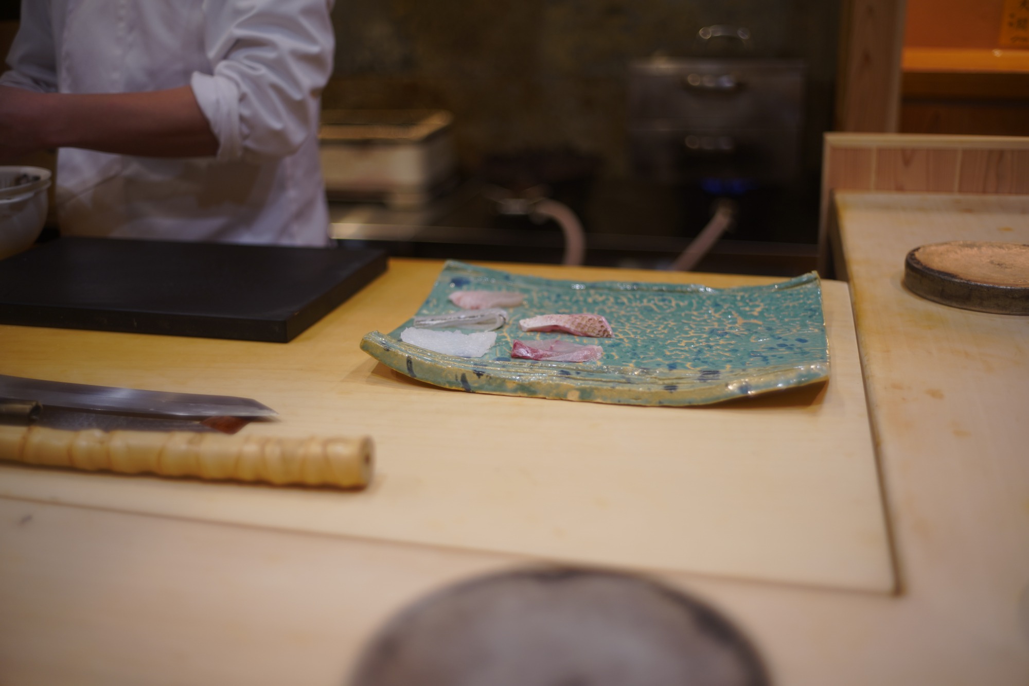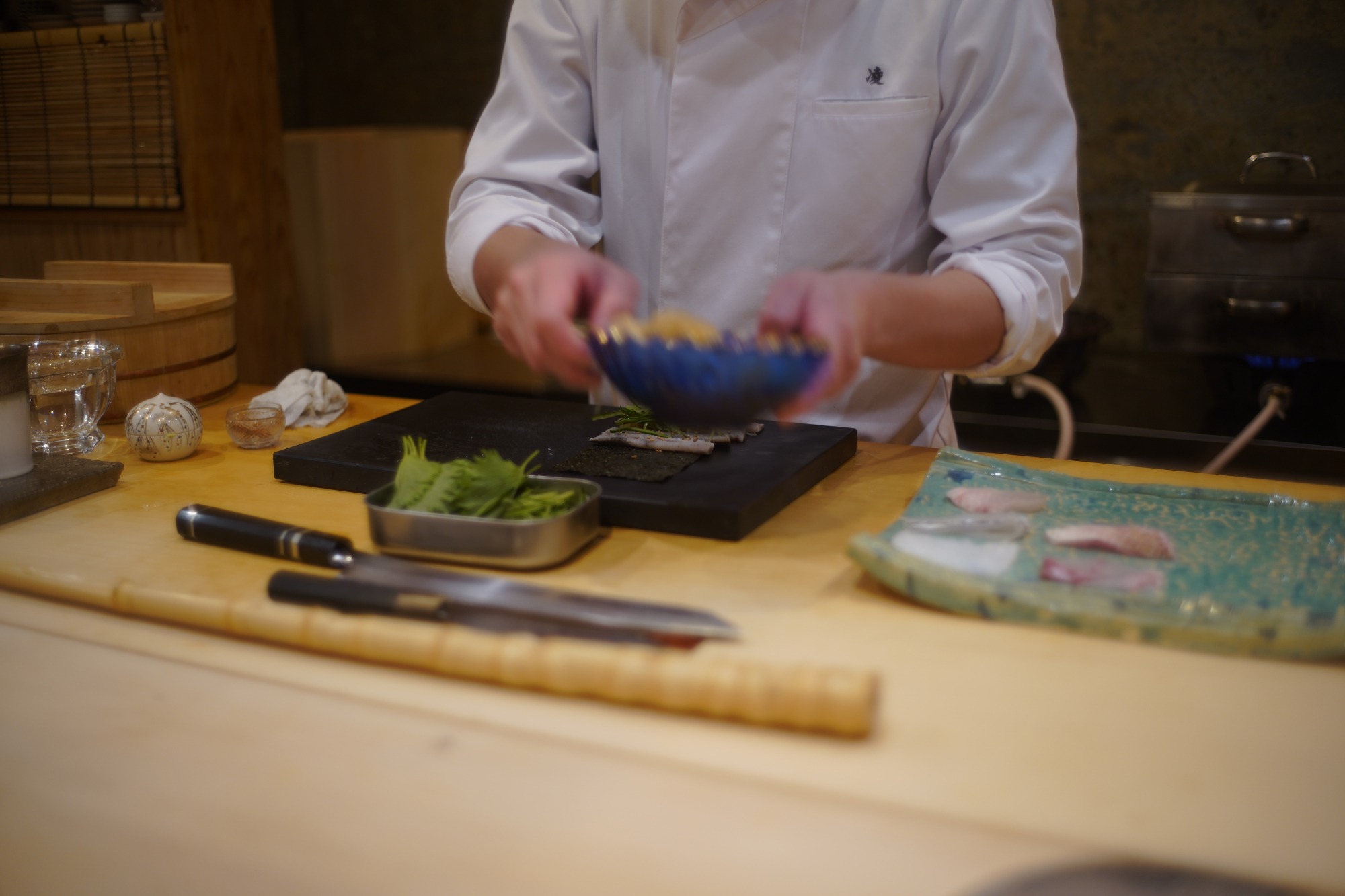 板場に置いた包丁の刃を客に見せないよう、竹棒をカウンターとの間に置くなど、客目線での配慮が随所に見られる。