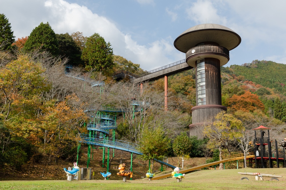 福井県おおい町の「きのこの森」は、特産品のきのこをモチーフにしたテーマパーク。きのこの森の目玉といえば、なんといっても総延長460mの「ビッグスライダー」。シンボルの「きのこタワー」のエレベーターで頂上へ上がり、2種類のコースから好みのルートで一気に滑り降りる爽快感は、子どもはもちろん大人も思わず笑顔になるほど。滑り用マットは現地でレンタルできるので手ぶらでOKです。芝生広場では動物の遊具でのびのびと遊べるほか、木製アスレチックやトロッコ、ムーンカートなど年齢を問わず楽しめるエリアが充実。入園料も大人300円・子ども200円と財布にやさしく、家族みんなで一日中遊んでも安心です。