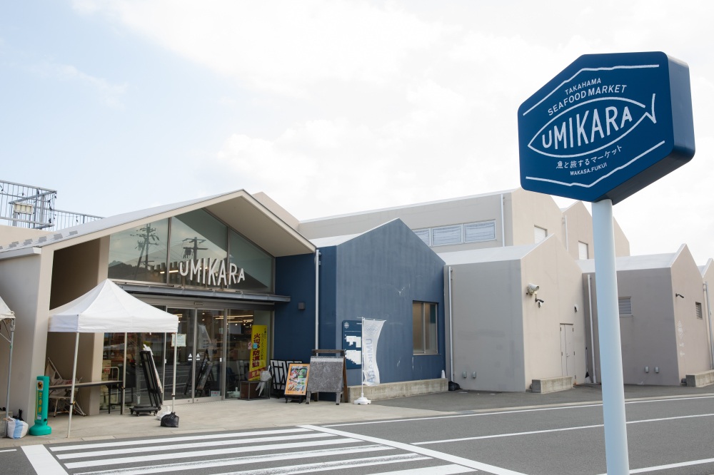 高浜町「UMIKARA」は、漁港で獲れたての魚介が毎日並ぶ体験型フィッシュマーケット。地元漁港直送の鮮魚を中心に、刺身や干物などさまざまな魚介が揃う「UMIKARA Market」では、水槽の中で泳ぐ魚を網ですくい、その場で刺身に加工してもらうというユニークな体験も楽しめます。