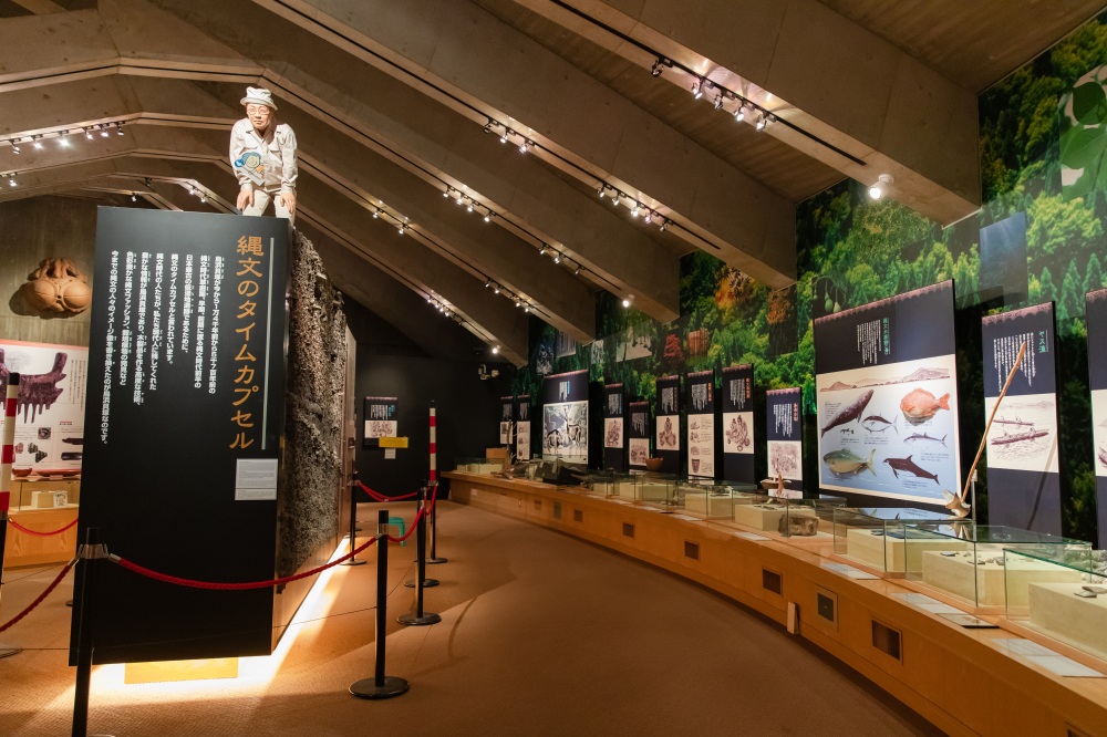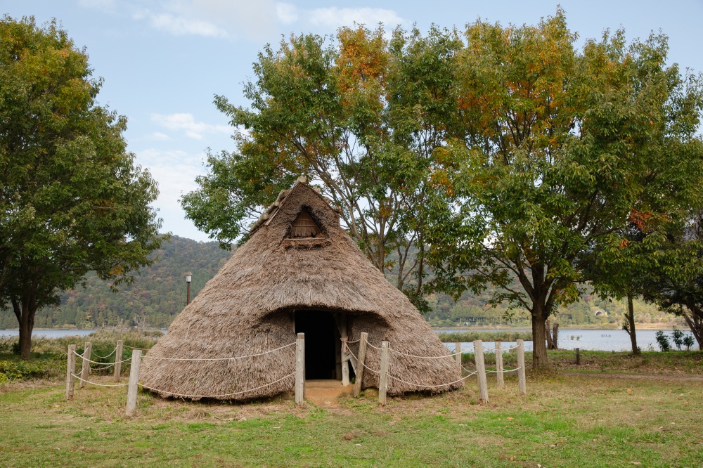 若狭町の湖畔に佇む「若狭三方縄文博物館(DOKIDOKI館)」は、土偶の腹部を模したユニークな外観が目を引く考古博物館です。館内には鳥浜貝塚をはじめとする縄文時代の遺跡から出土した丸木舟や土器、石器などがずらりと並び、はるか1万年前の暮らしをリアルに感じることができます。屋外の「縄文ロマンパーク」では竪穴住居が復元されており、勾玉や土笛づくり、火おこし体験など、子どもが夢中になる体験メニューが充実。館内では年縞(湖底堆積物)の展示や顕微鏡コーナーもあり、大人も十分に楽しめる奥深さがあります。見るだけでなく、触れて体験できる展示が多いので、家族みんなで縄文の世界にどっぷり浸れます。