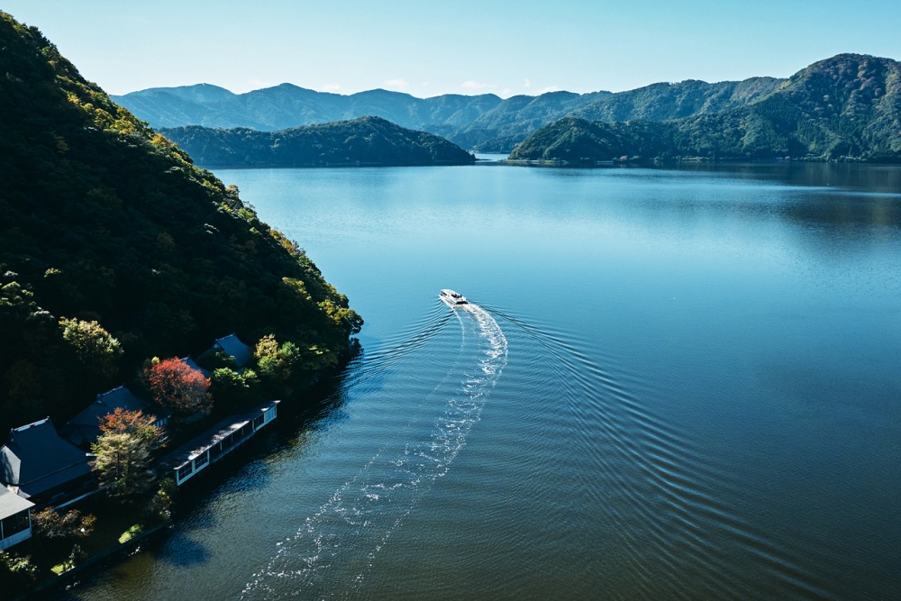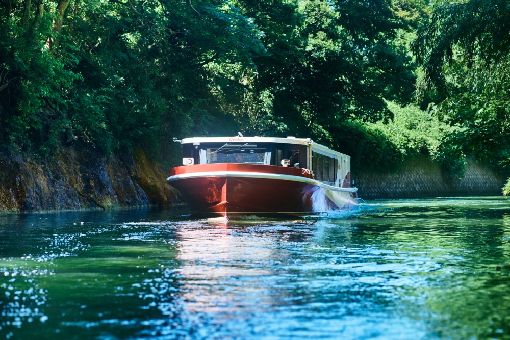 クルーズのハイライトは、幅わずか7.2mの細い水路「浦見川」を抜けるシーン。船がすれ違えないほどの狭さのため、両岸に迫る緑が生い茂る様子はまるでジャングルクルーズのよう。運が良ければサルやイノシシ、シカの姿を見ることができるかもしれません。CO₂排出ゼロのエコな船旅は、子どもたちへの環境教育のきっかけにもなりそうです。クルーズ拠点にはカフェやレンタサイクルも揃っていますので、四季折々に変わる三方五湖の表情を水上からぜひ楽しんでみてください。