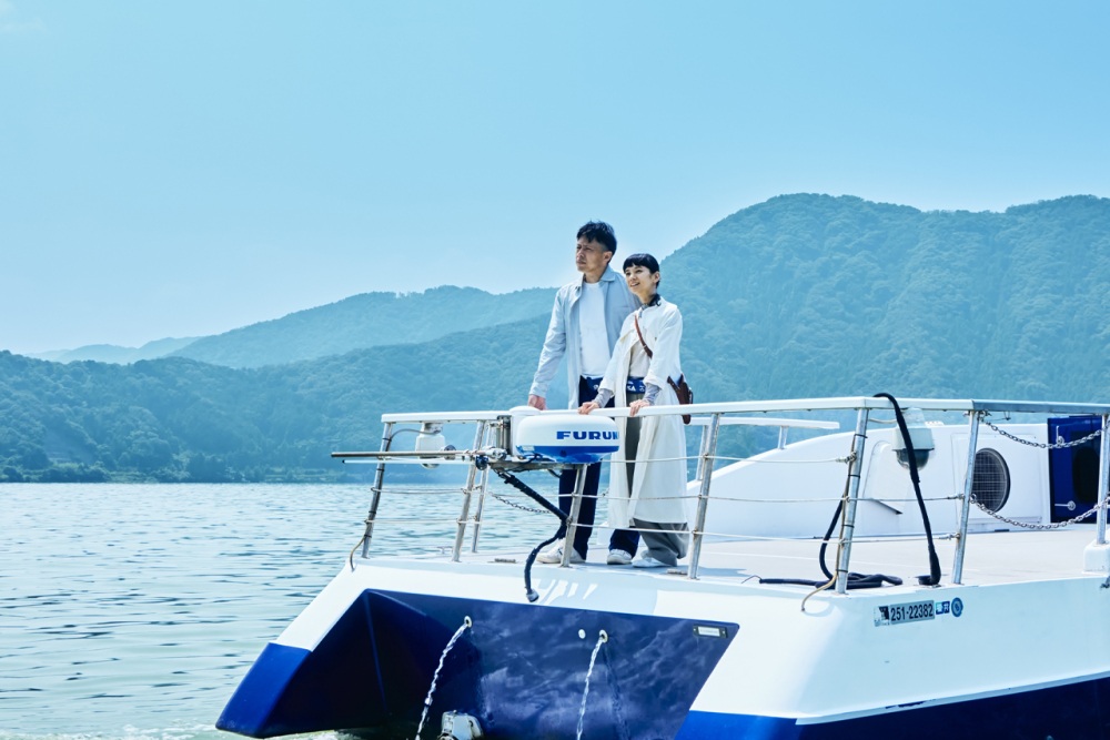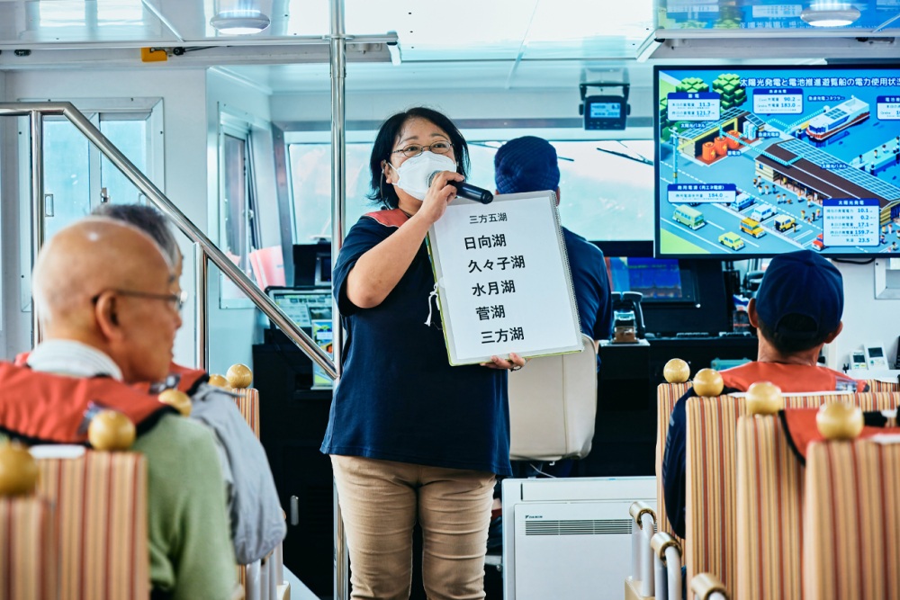 美浜町の「三方五湖ネイチャークルーズ」では、久々子湖から浦見川、水月湖へと続く約50分の湖上クルーズが楽しめます。太陽光などの再生可能エネルギーで航行する電池推進の遊覧船はエンジン音のない静かな乗り心地。船内ガイドの解説を聞きながら湖畔の自然や野鳥をゆっくりと観察できるのが魅力です。