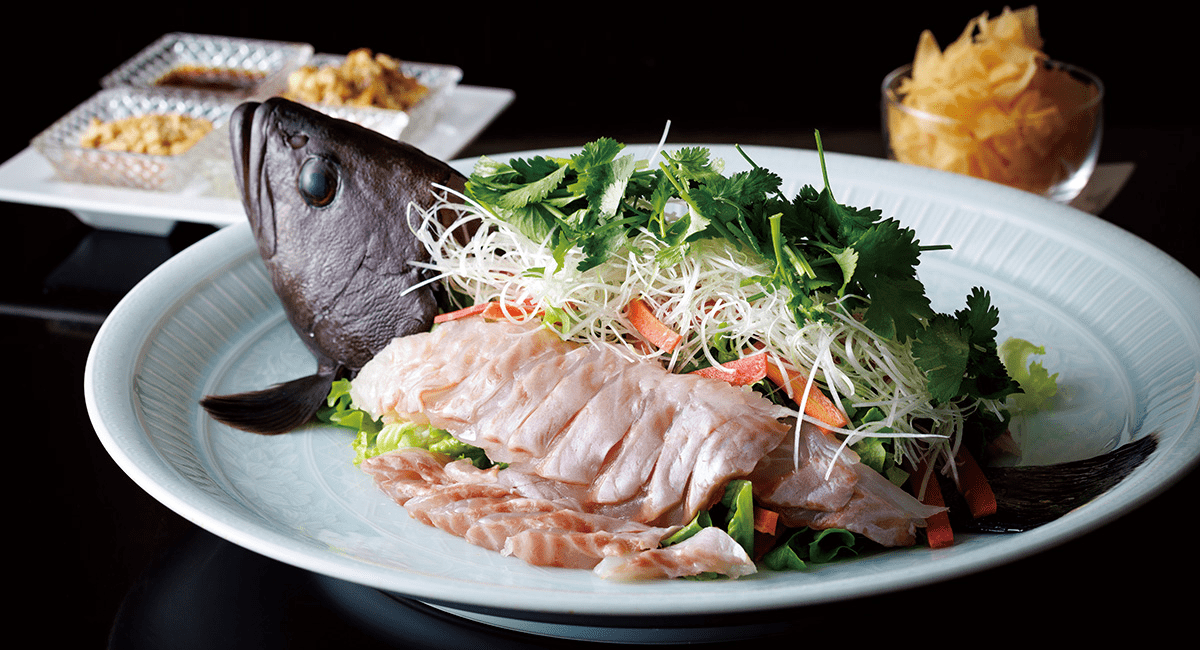 上品な脂がのった若狭まはたを刺身にし、白髪ネギやシャンツァイといった香味野菜などと共に盛り付け、すべてを混ぜ合わせて味わう。揚げたワンタンの皮やピーナッツ、クルミなどが食感良く、アクセントに。姿からは想像がつかない繊細な味に驚嘆する。
