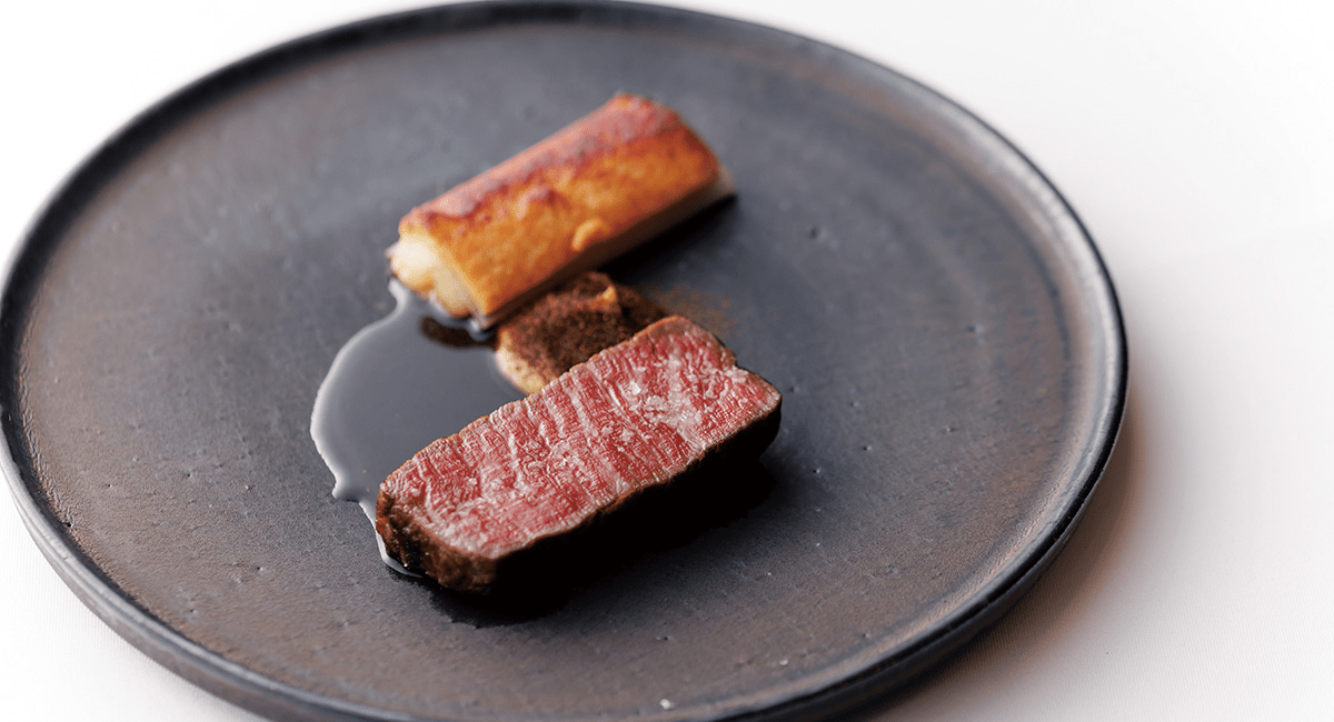 特長であるサシが美しく入った若狭牛をじっくりと焼き、旨味成分を閉じ込めた。厚めに切り分けても柔らかさはそのまま。鯖江市で昭和初期から作られている伝統野菜「川島ごぼう」のフリットのコクのある味にもよく合う。
