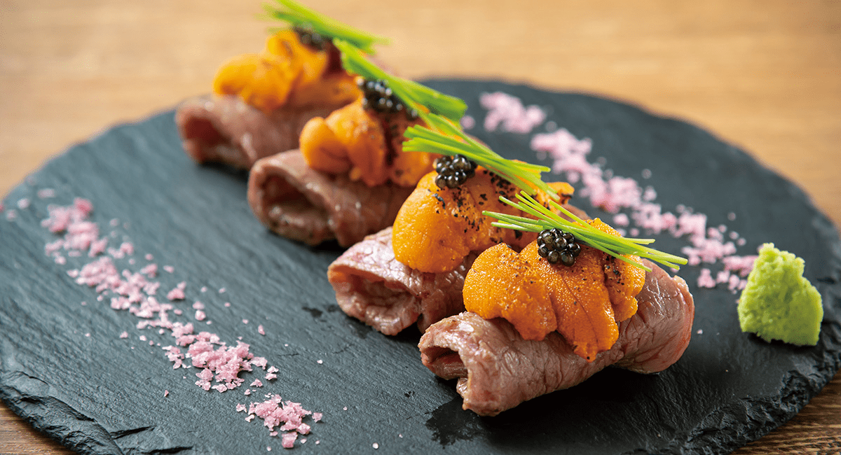 炙った若狭牛に、生のウニを贅沢に盛り付け。オレイン酸を含む若狭牛は口の中に入れた瞬間に脂が溶け出し、柔らかな食感に変化。さらに鮮度の良い濃厚なウニも溶け合う。添えられたわさびやワイン塩で味わえば、またひと味違うマリアージュが楽しめる。