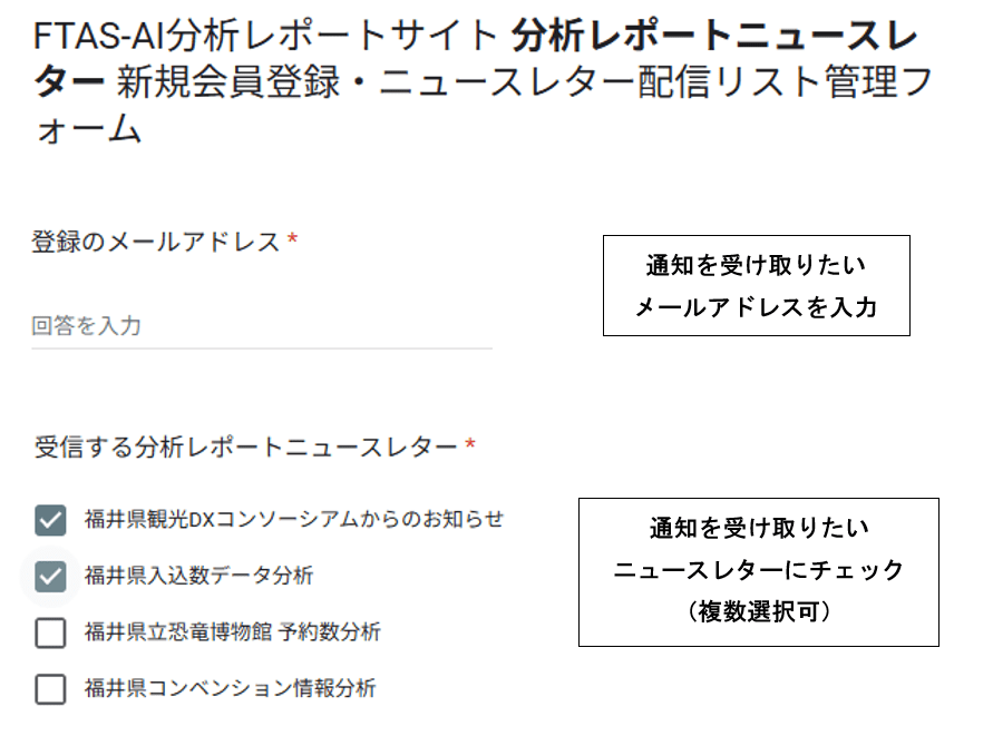 ③レポートを受け取りたいメールアドレスを入力し、通知を受けたいニュースレターを選択