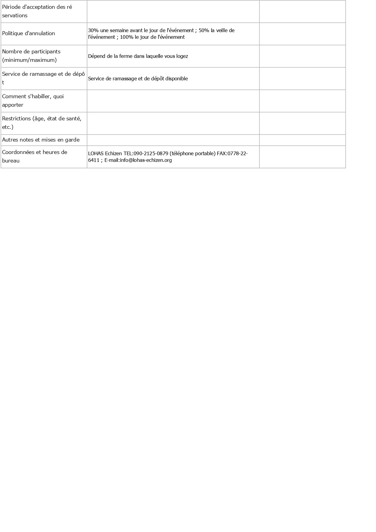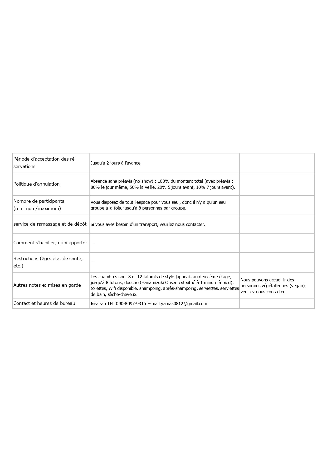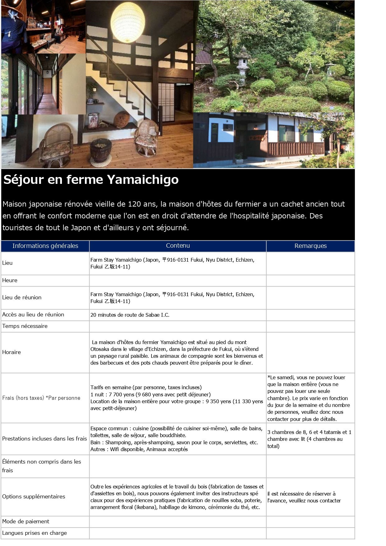 Contenu, tarifs, capacité d'accueil, détails des réservations, etc. en français, anglais (English) et allemand (Deutsch)