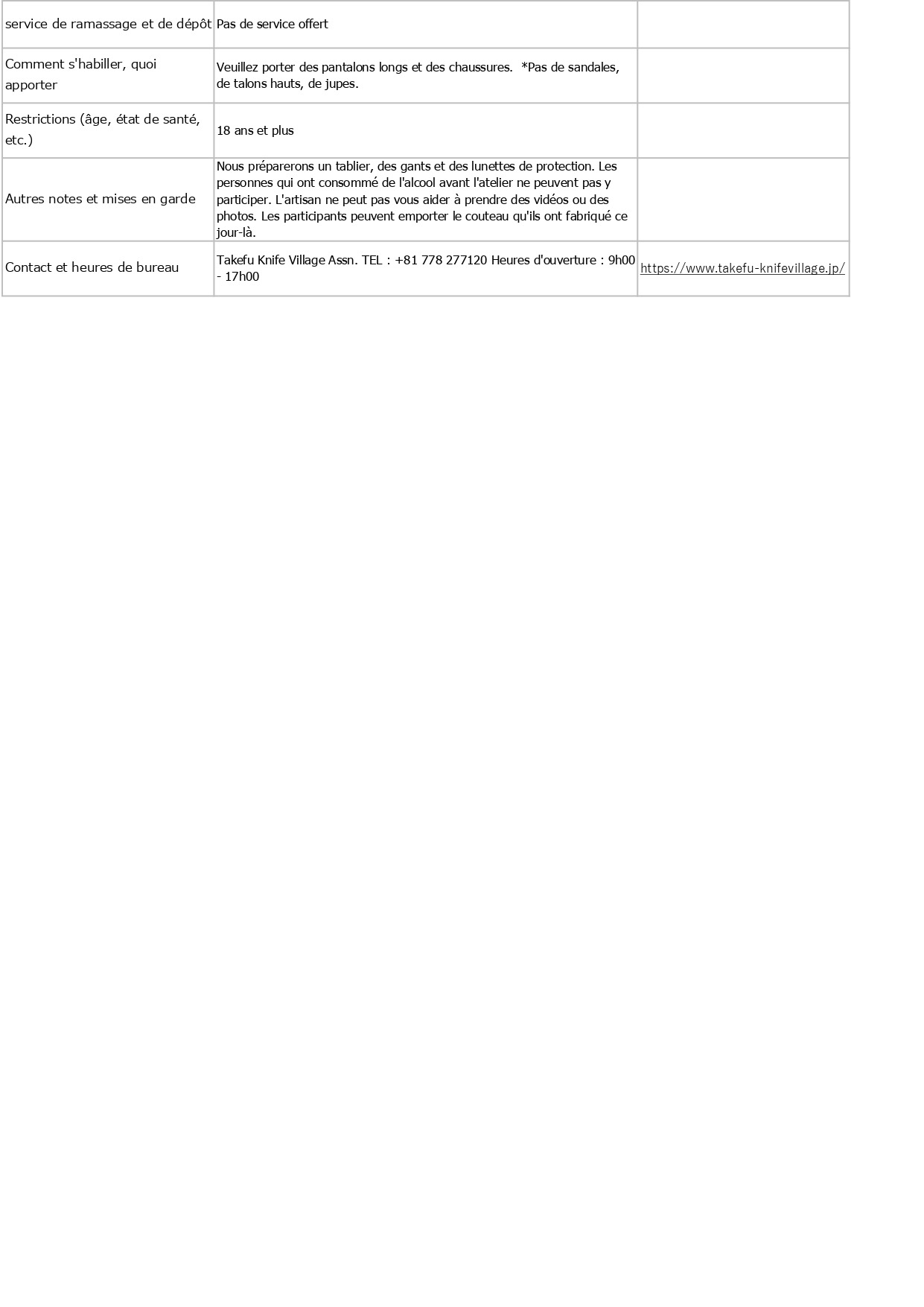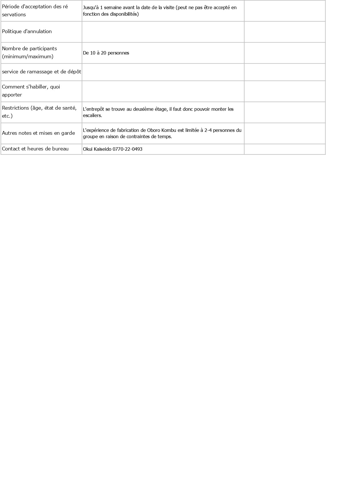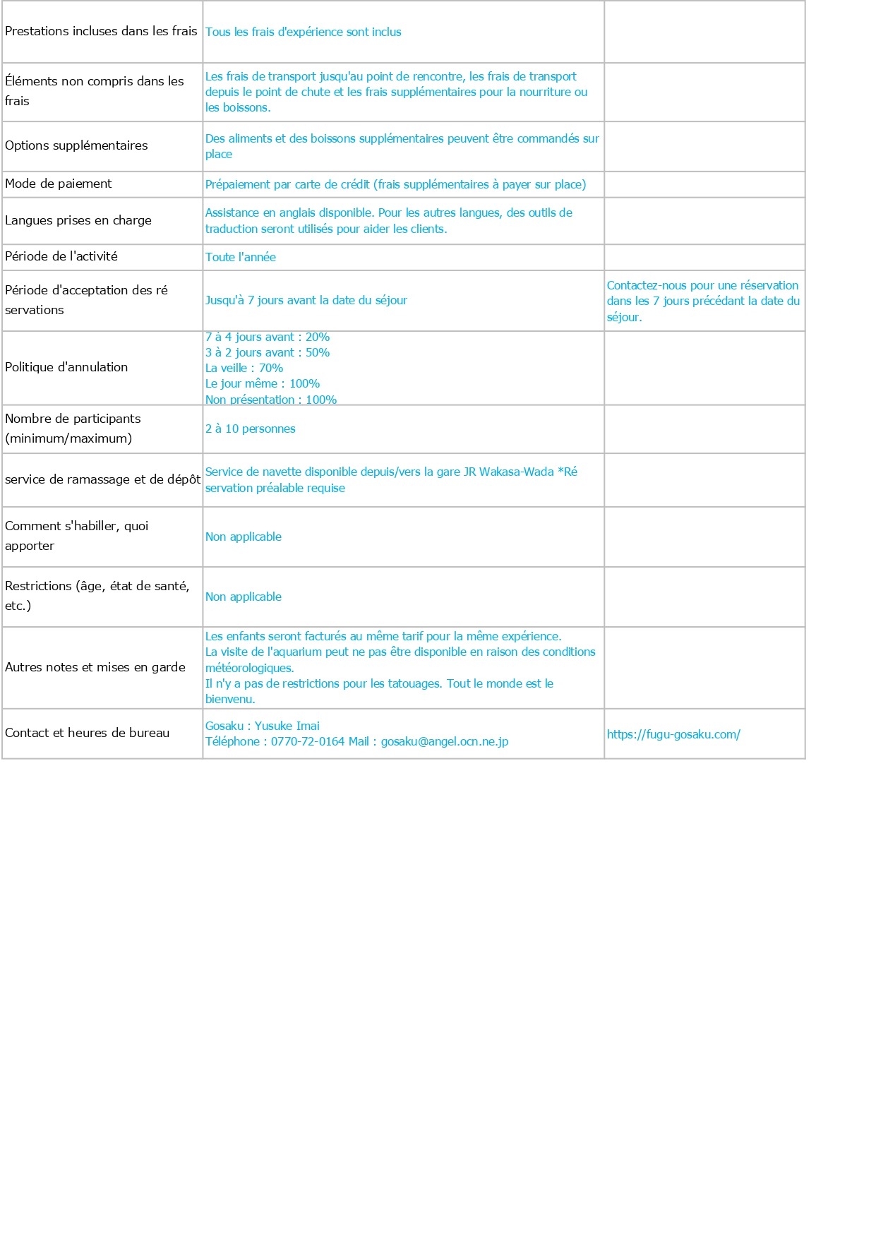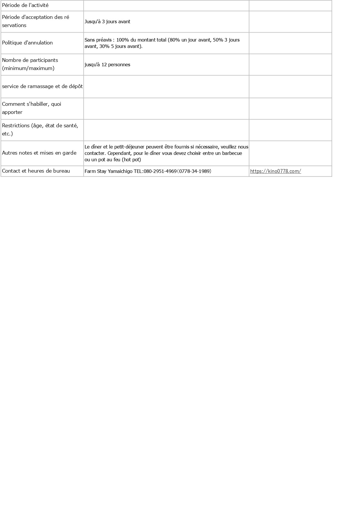 Contenu, tarifs, capacité d'accueil, détails des réservations, etc. en français, anglais (English) et allemand (Deutsch)